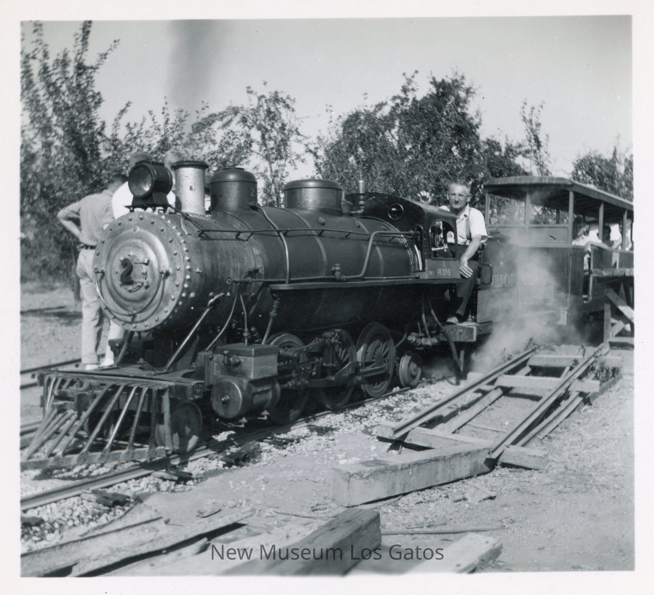 A black and white photograph featuring the Wildcat Railroad train. The steam engine and the first passenger car are pictured, and there are people sitting on/in both. There is steam coming out of the top of the engine, as well as near the wheels in the back of the engine. There are a few people standing to the left of the engine, with their backs towards the camera The image is surrounded by a white border.Collection
