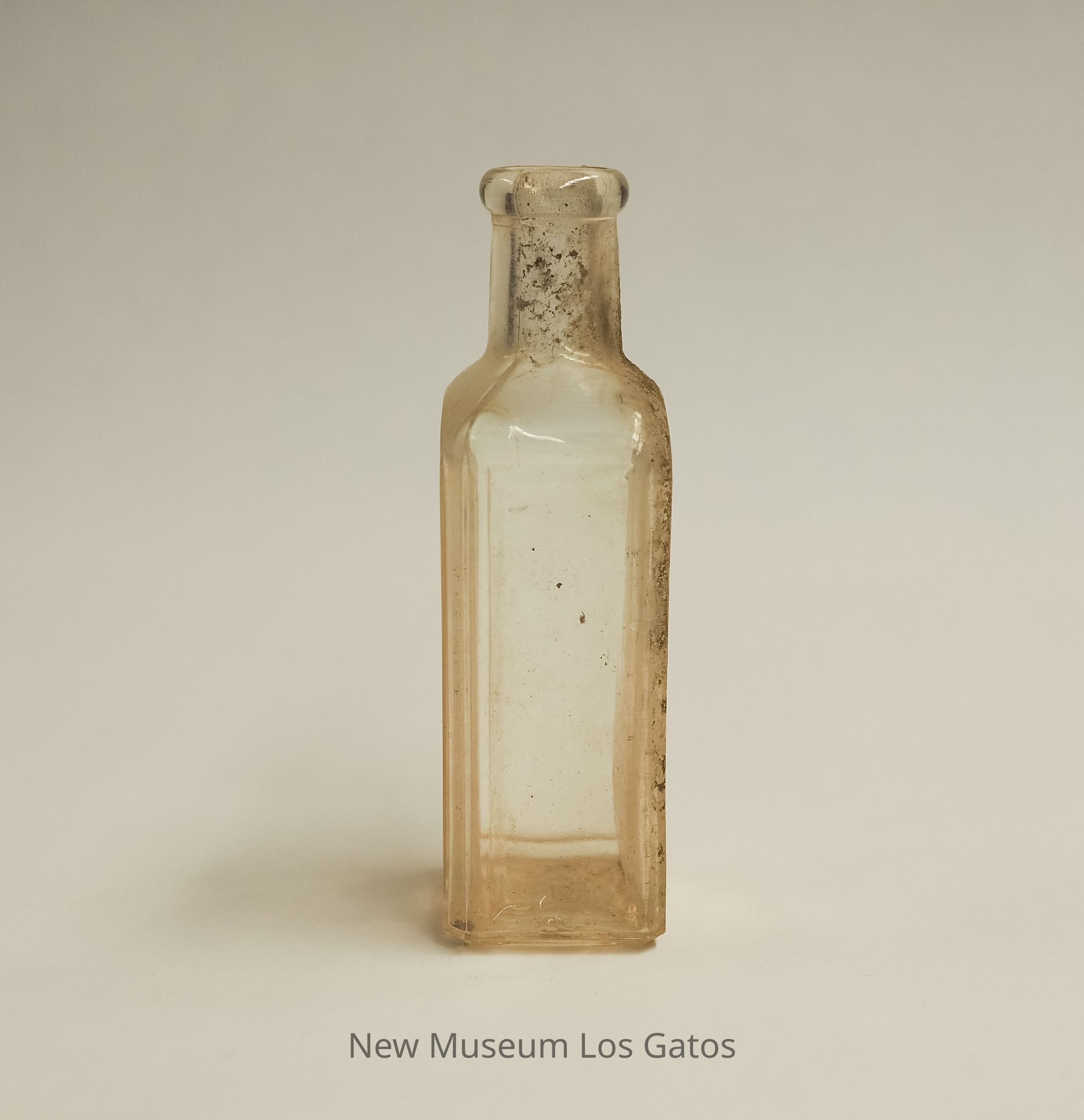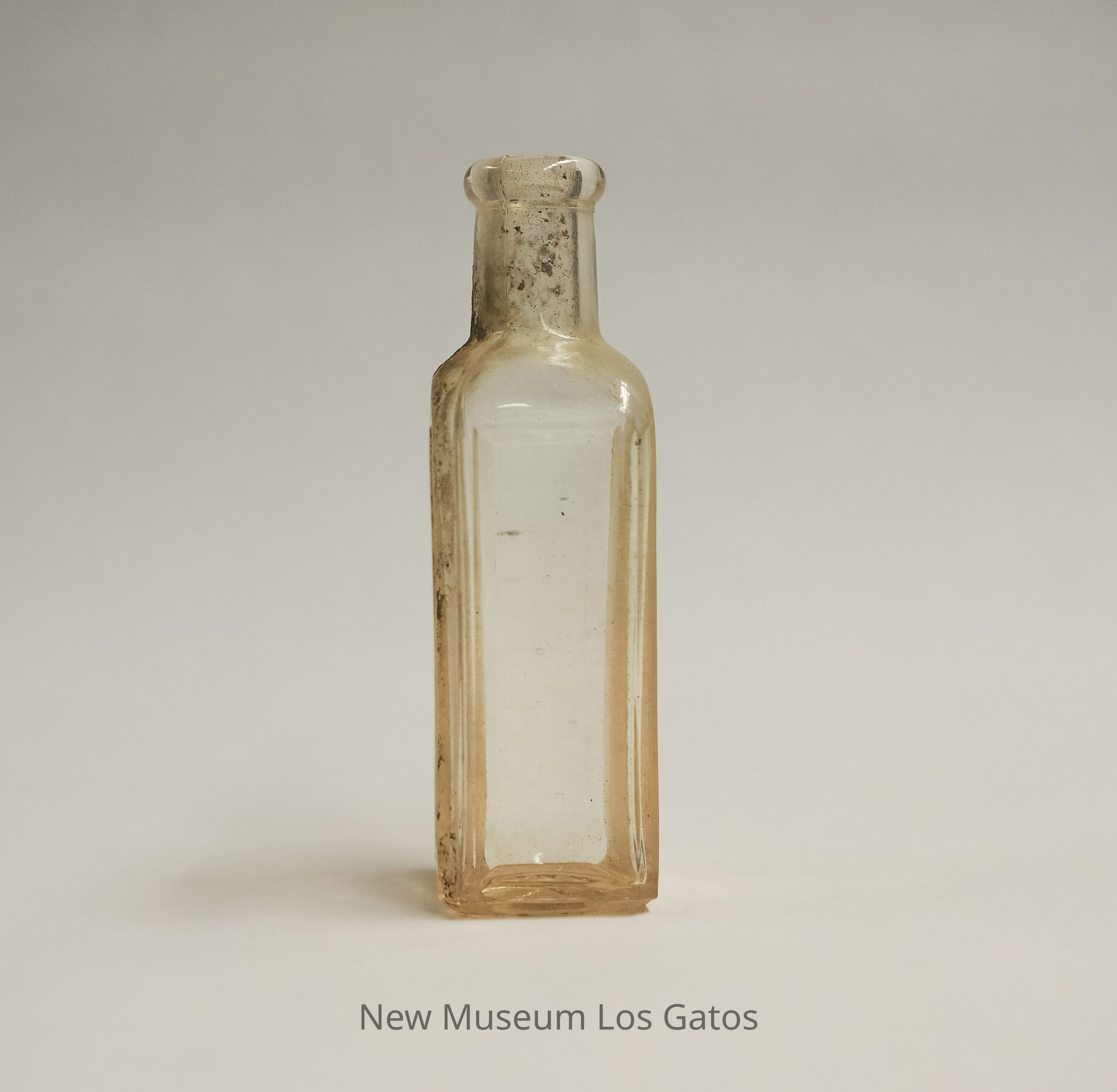 A small clear glass bottle from The Singer Manufacturing Company that likely contained oil for sewing machines. The embossed label is an oval with the company name, yarn ball, and knitting needles superimposed over an S symbol, and a laurel wreath at the bottom.Collection