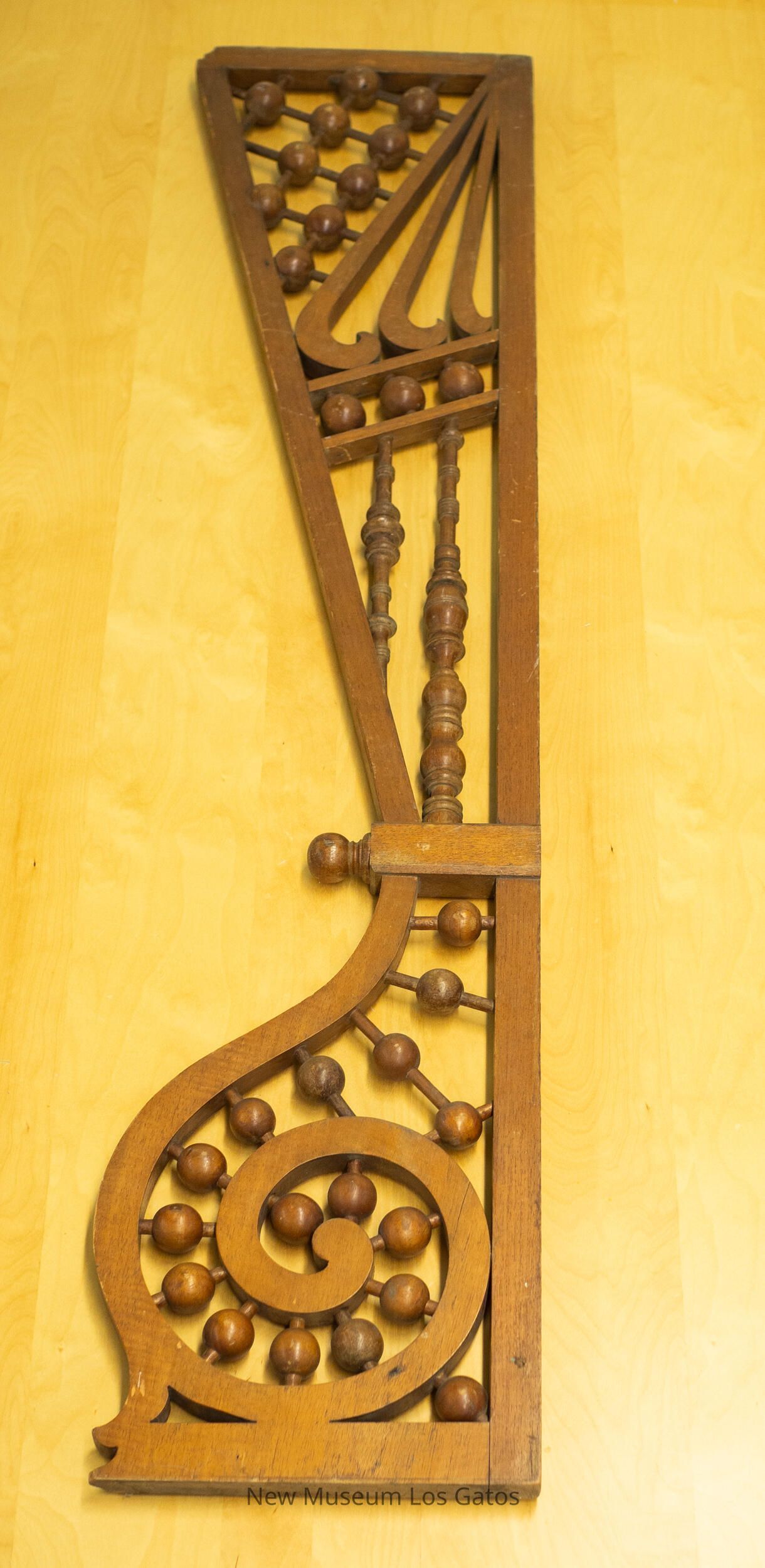 Decorative wooden bracket, with three sections. The top section has three stylistic J-shapes, with rows of wooden balls. The middle section has decorative, vertical wooden columns. The bottom section has a swirled solid wooden piece, with wooden balls following the path of the swirl.Collection
