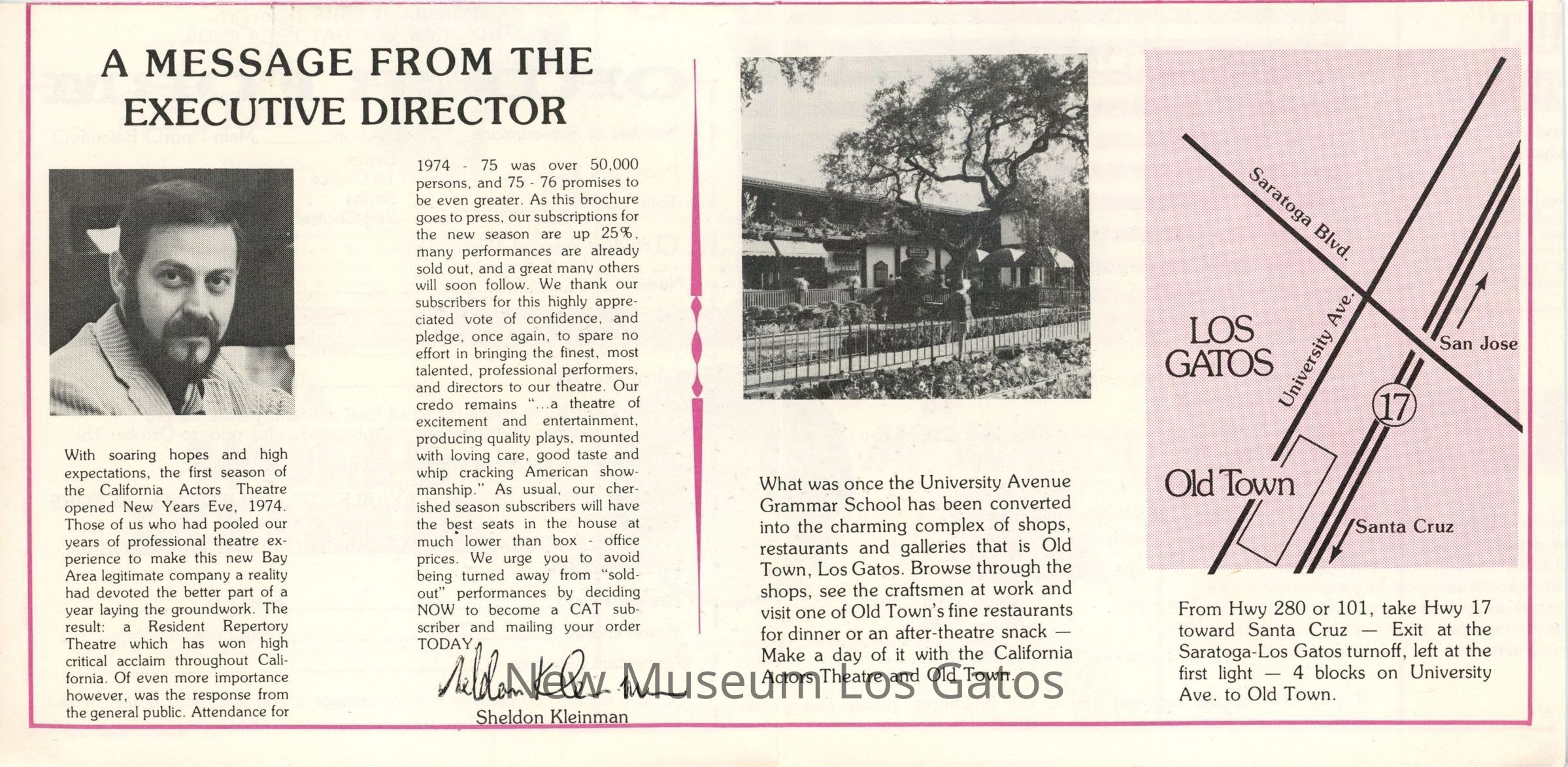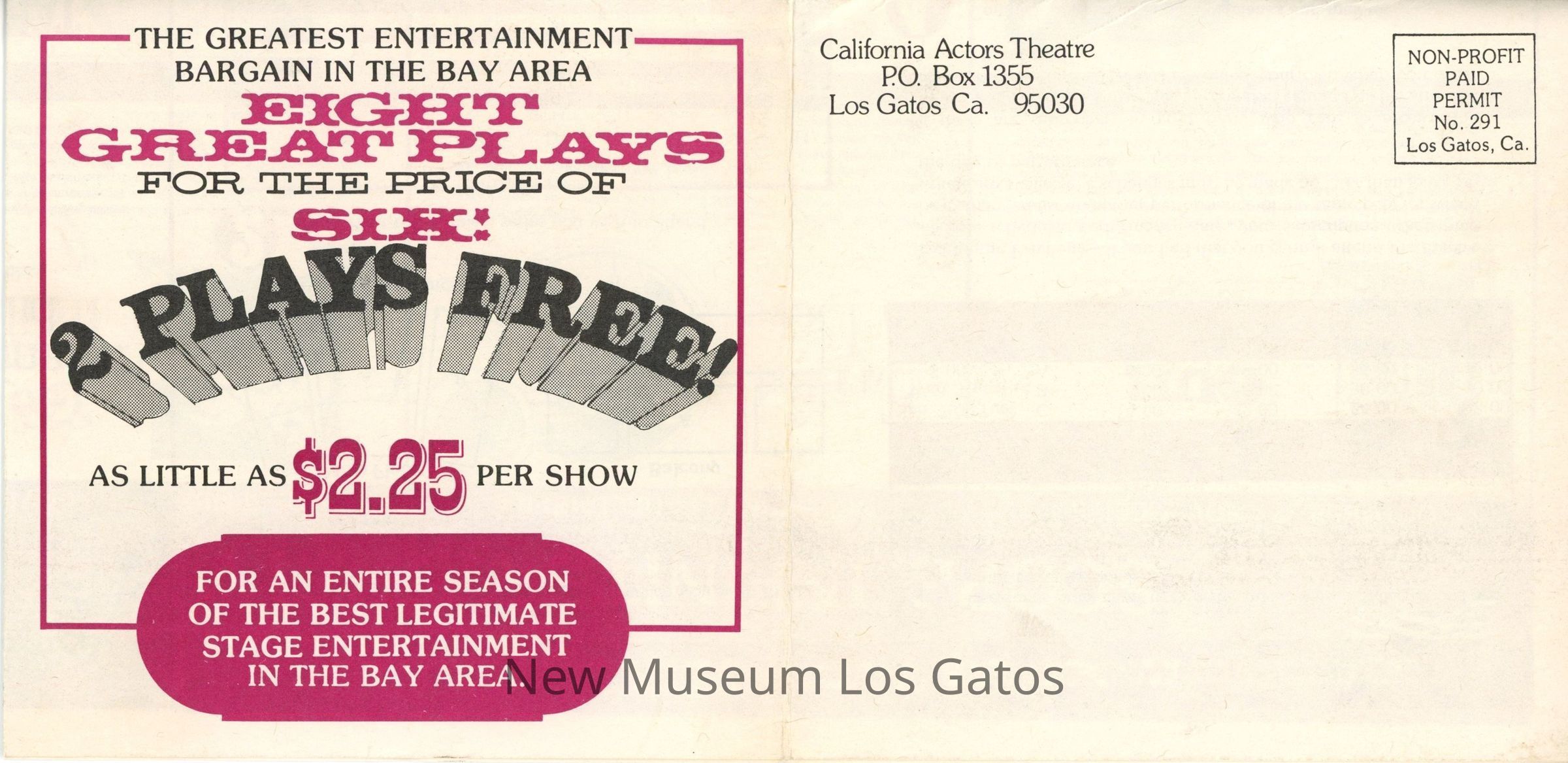 A promotional mailer for the California Actors Theatre's second season, from 1975-1976. The mailer includes reviews from season one productions, ticket information, a letter from the executive director, and a list of season two's plays. The mailer features black and white text with pink accents.