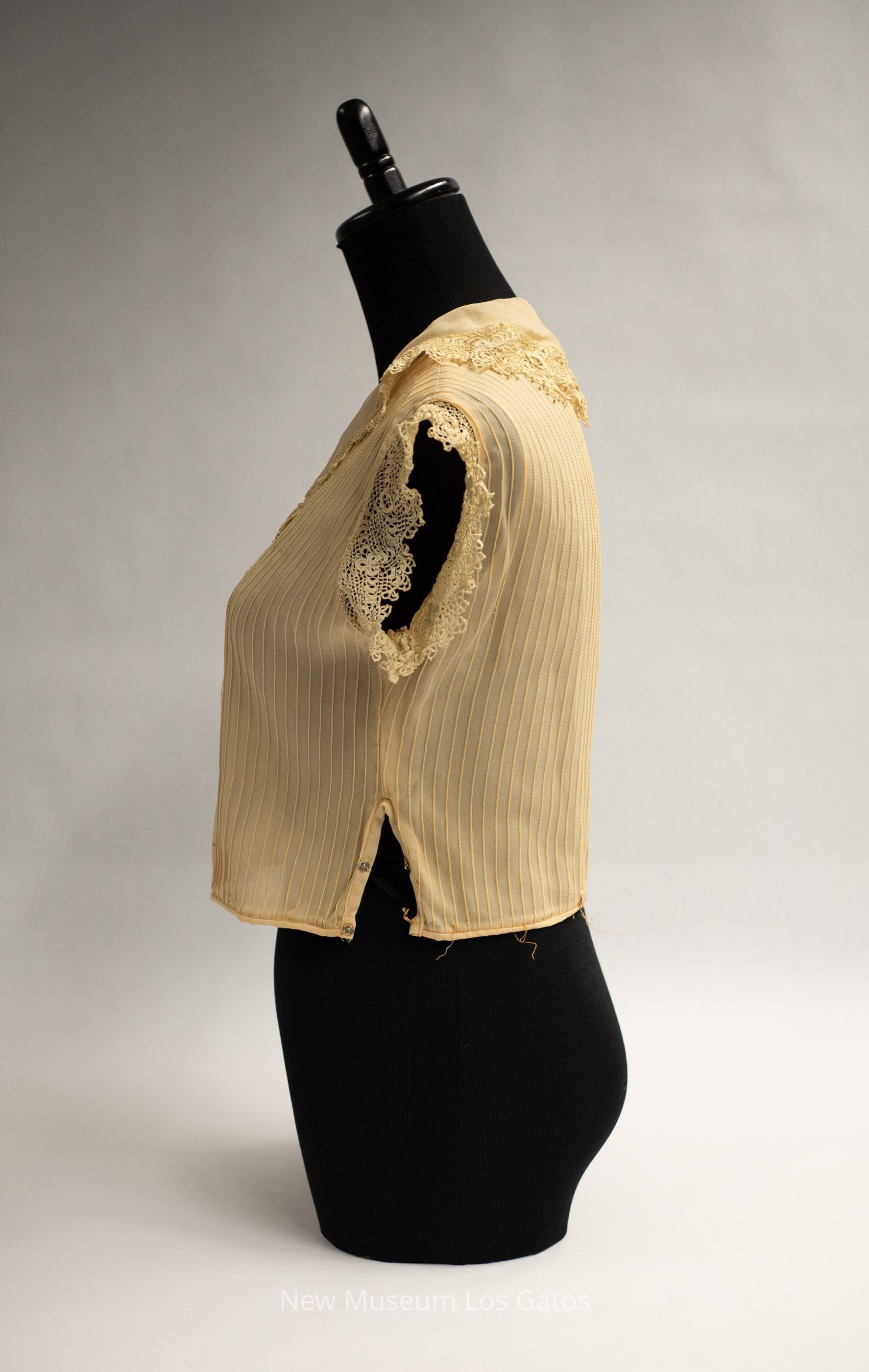 A small light brown/cream colored (ecru) silk blouse. There is vertical stitching, forming a line pattern throughout the blouse. There is tatted decorative trim at the edges of both sleeves, as well as around the collar and neckline There are seven ornamental buttons in the bodice, and two functional snaps at the bottom edge, on the left side of the blouse.Collection
