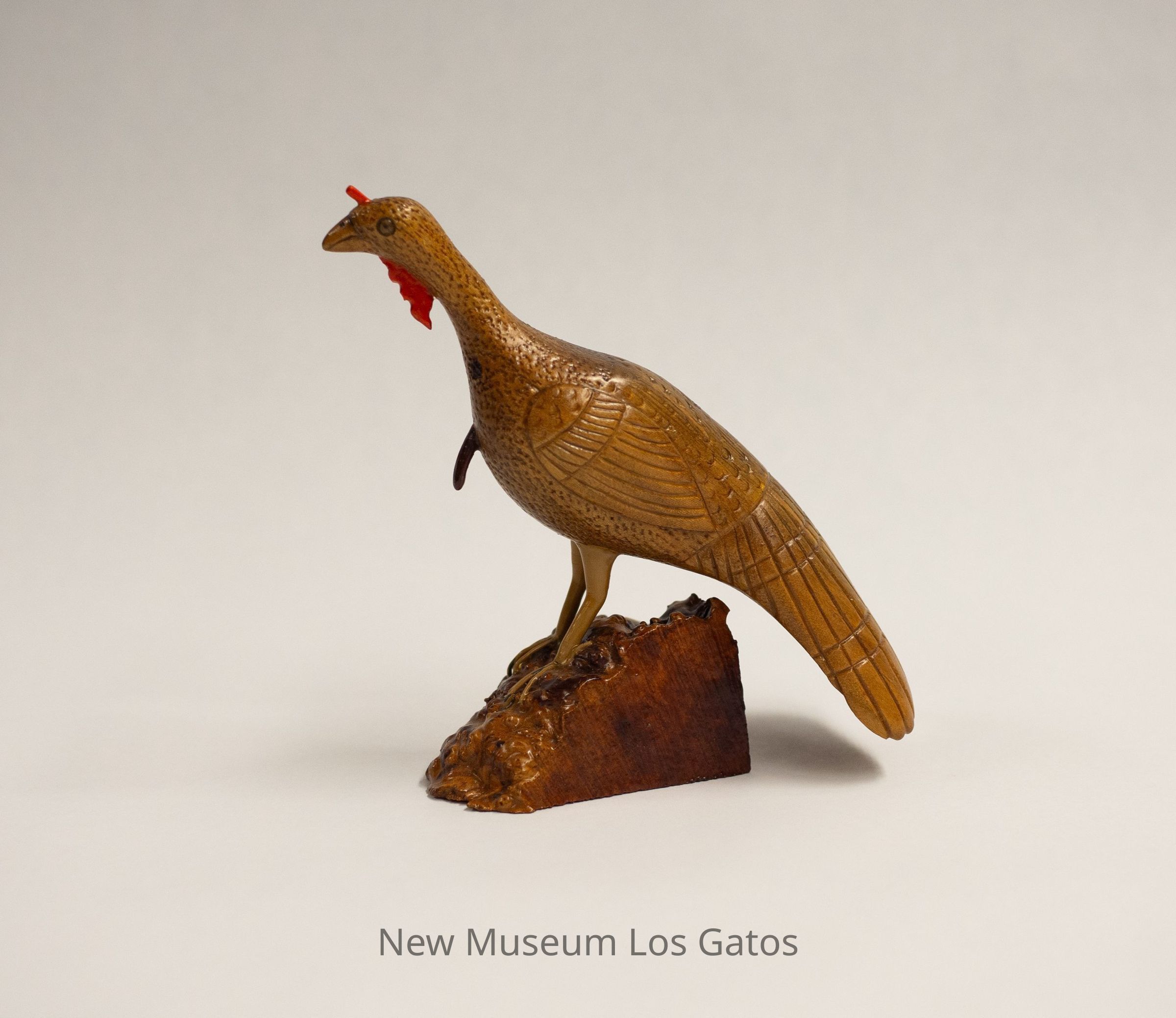 A brownish-yellow hand-carved wooden sculpture of a bronze turkey standing on a sloped, mottled brown base. The turkey has a red snood and wattle, and a dark brown beard.Type of Sculpture
