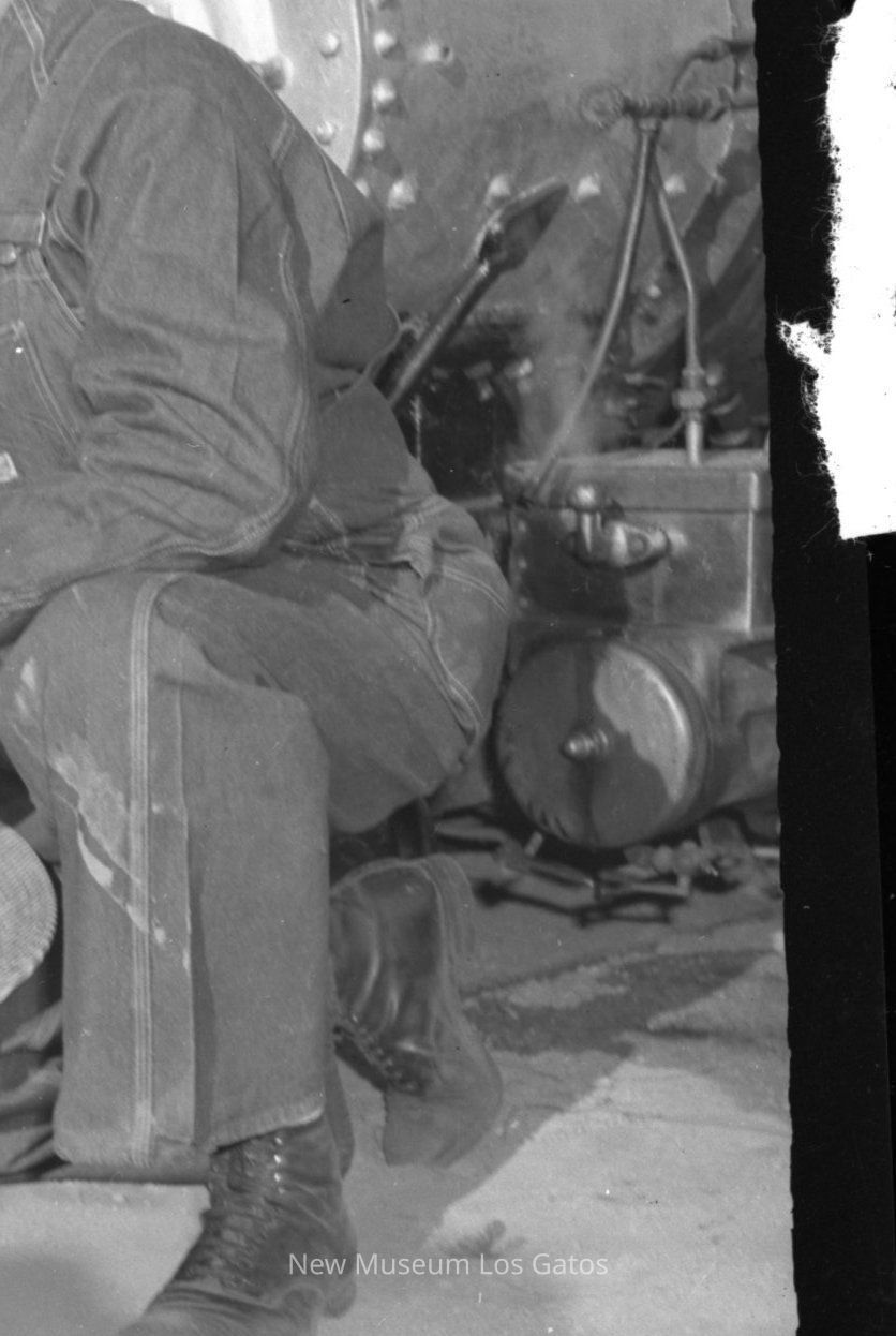 A black and white photograph negative, depicting two men at the golden spike ceremony for the Wildcat Railroad on October 16, 1943. The two men are surrounded by people, and are kneeling near the railroad tracks, with the train engine off to the right, while one is holding a hammer. The photo was found inside of a manila envelope, but it is unclear if the writing on the envelope has anything to do with the photo.