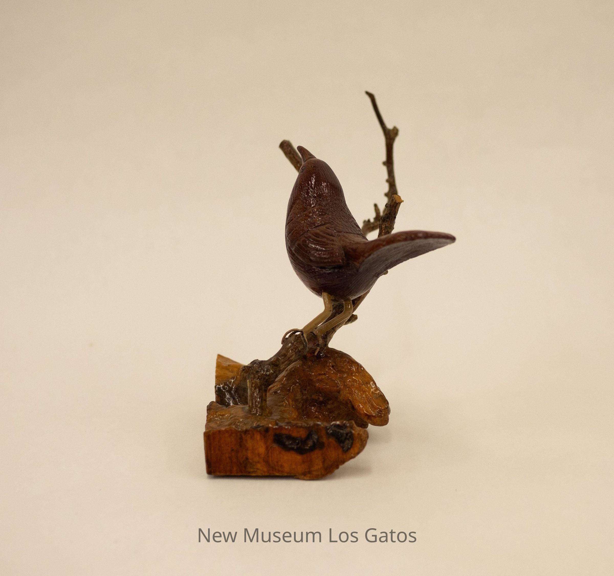 A dark brown hand-carved wooden sculpture of a bird perched on a thin stick that branches out into three parts, which is coming out of a lighter brown/mottled wooden base.Type of Sculpture