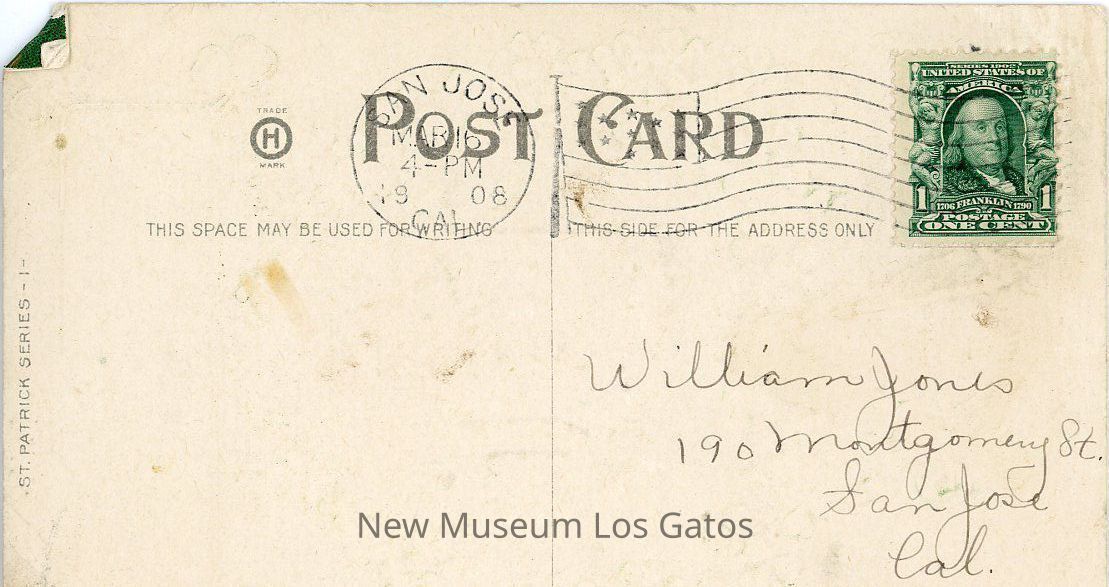 A postcard of with illustrated clovers shaped into a heart, with an illustration of Blarney Castle in the middle, as well as a harp.Subject