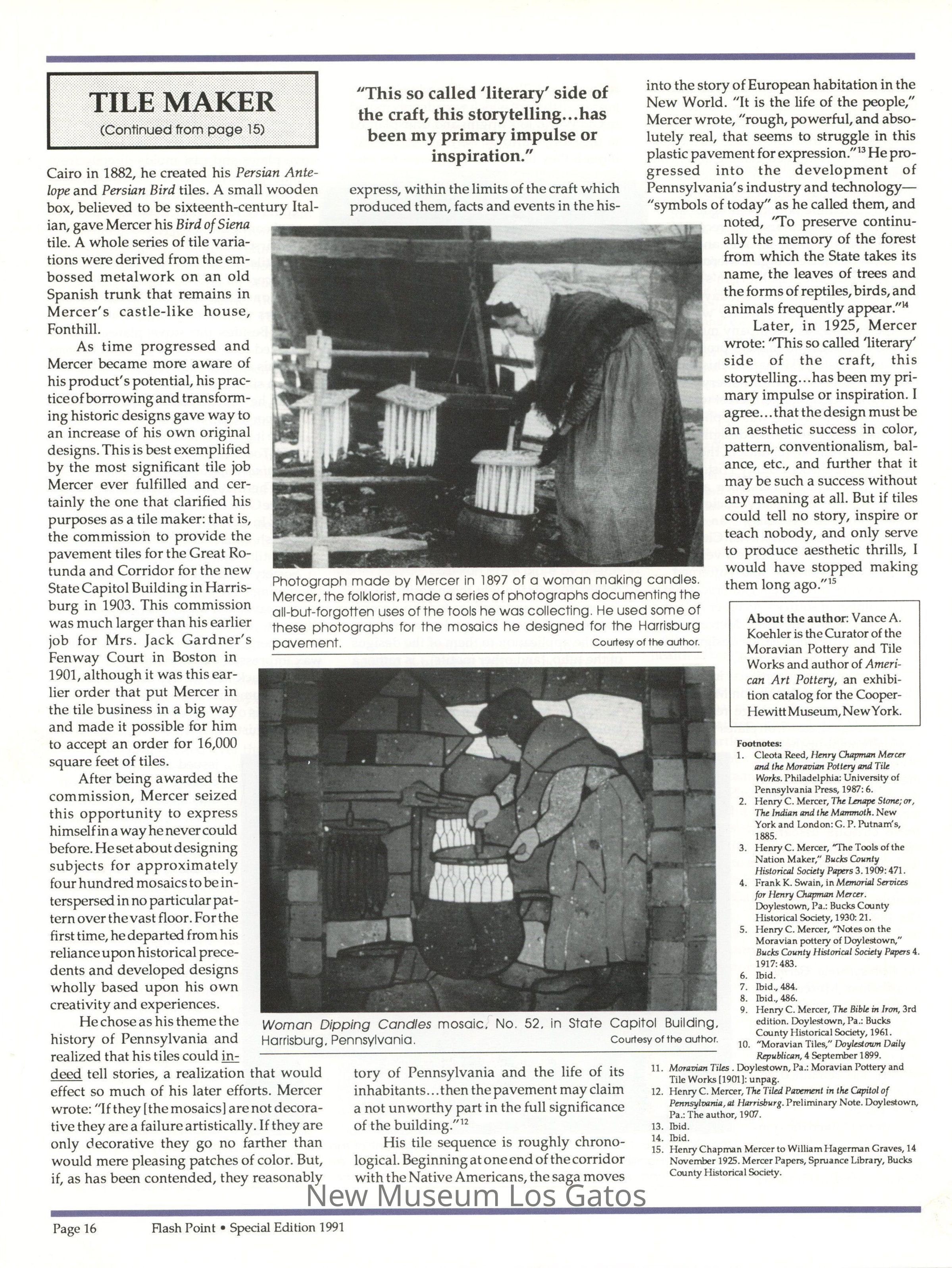 Flashpoint newsletter, published by the Tile Heritage Foundation, a special edition from 1991. The special edition contains a complete profile on artist Henry Chapman Mercer, as well as