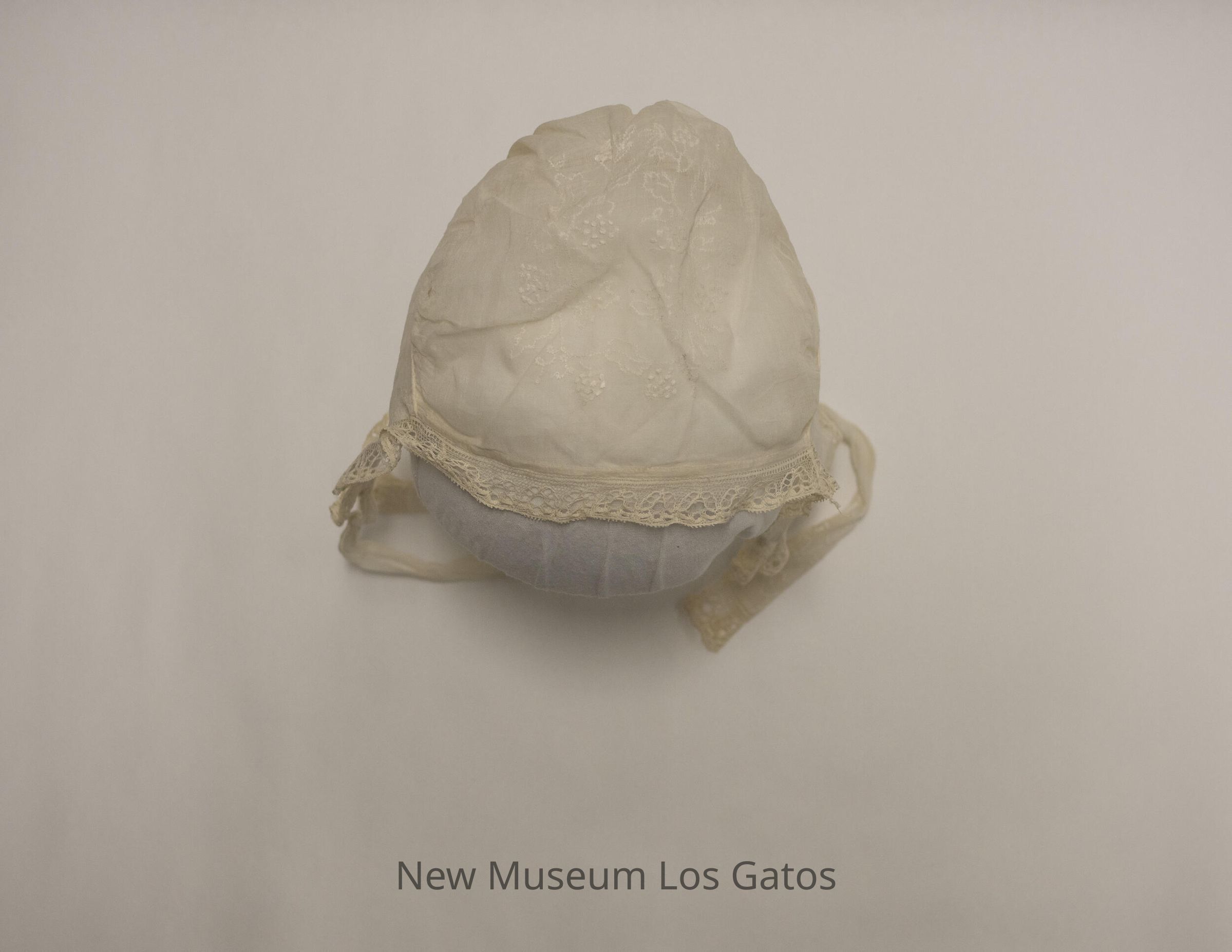 Batiste nightcap with lace trim around the cap and at the end of the ties. White, embroidered flowers decorate both the cap and the ties.