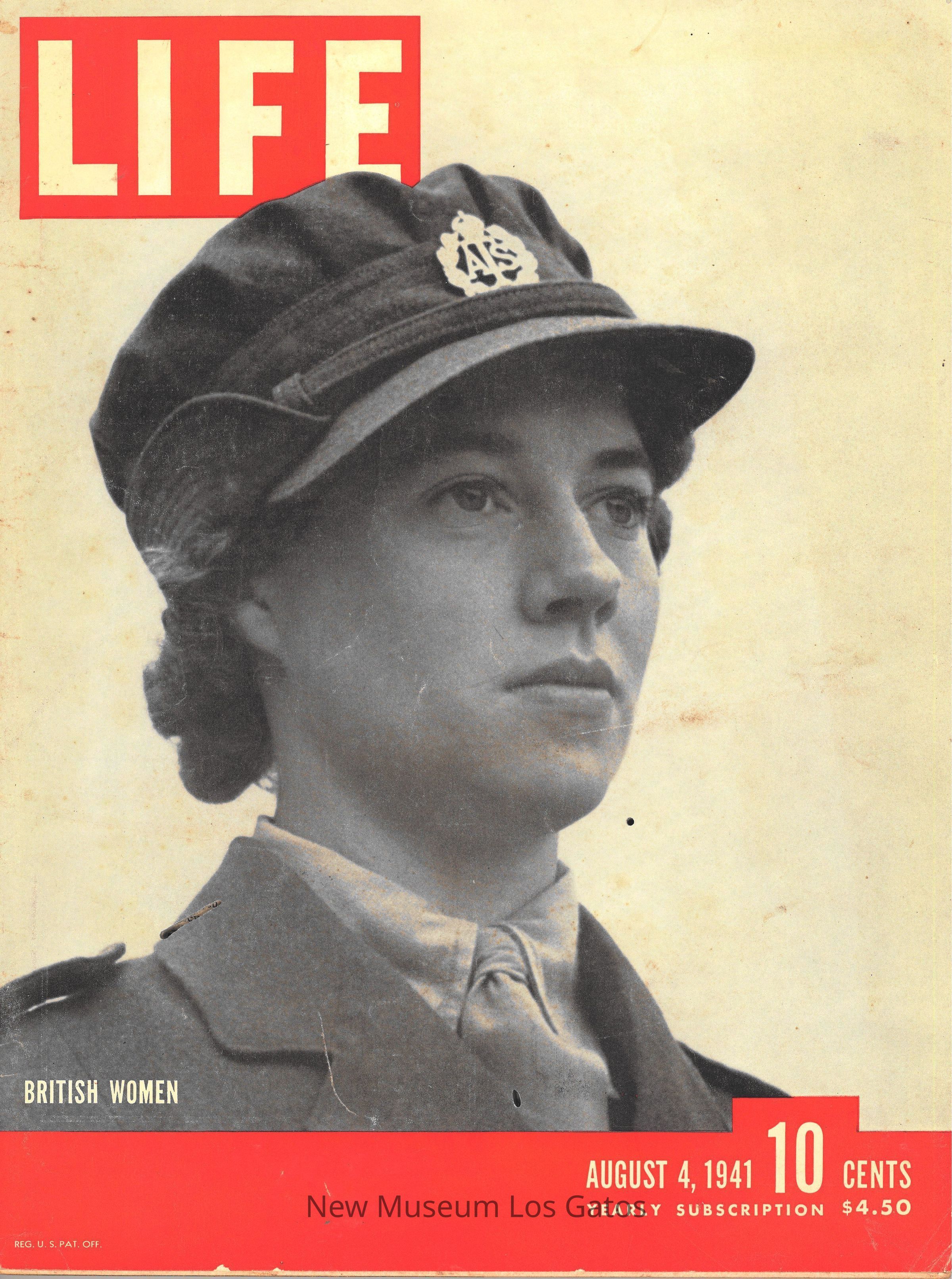 The August 4, 1941 edition of LIFE Magazine. The front cover features a black and white photograph of a woman in military clothing and a military hat, looking off into the distance.Collection