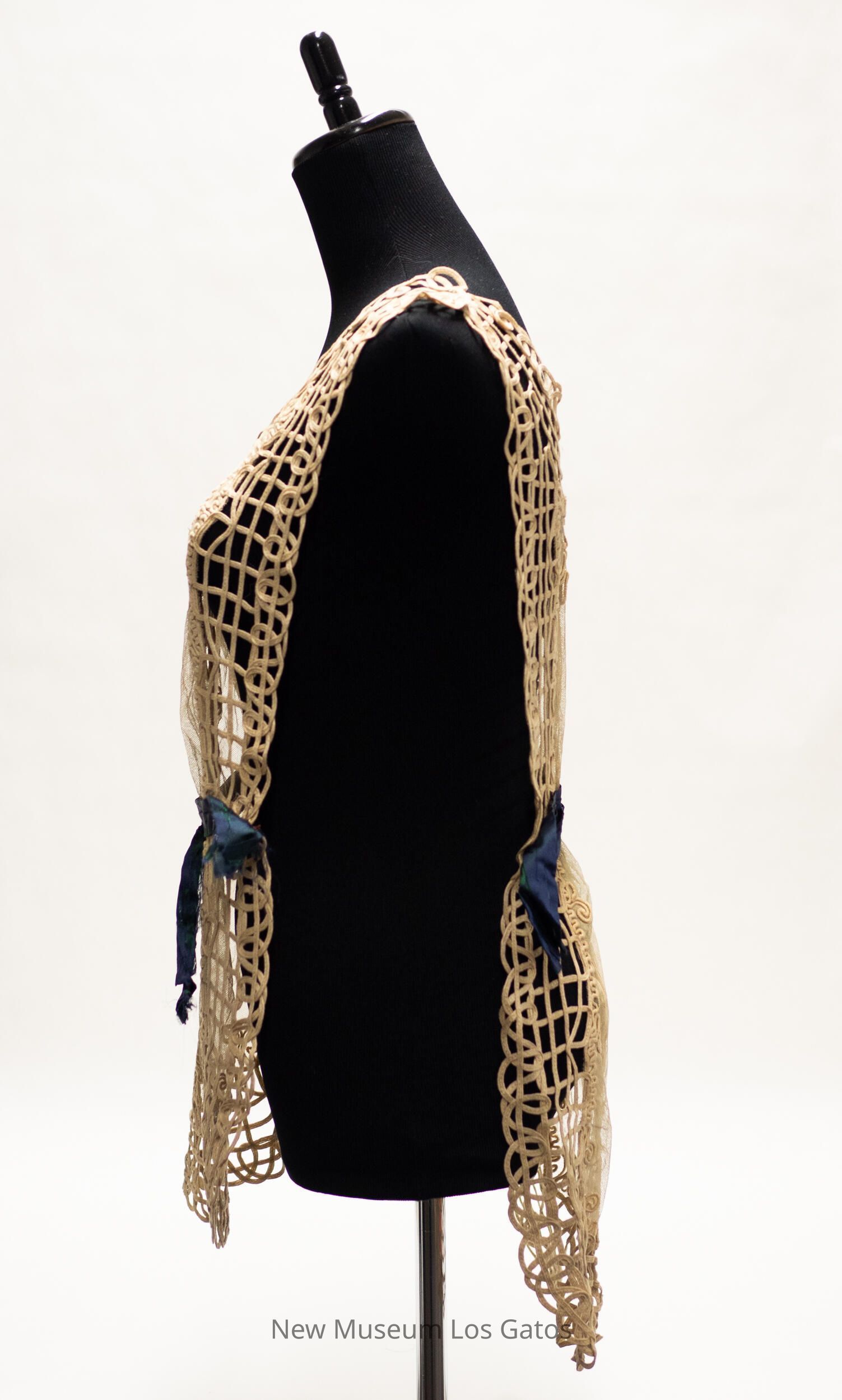 A beige colored vest, with sheer lace/netting in the center, and braided ecru along each edge as well as the neckline and shoulders. The netting has decorative soutache along its border. There is an attached navy silk belt along the center of the vest, which opens and closes with two metal hook-and-eye clasps on one of the shoulders.Collection