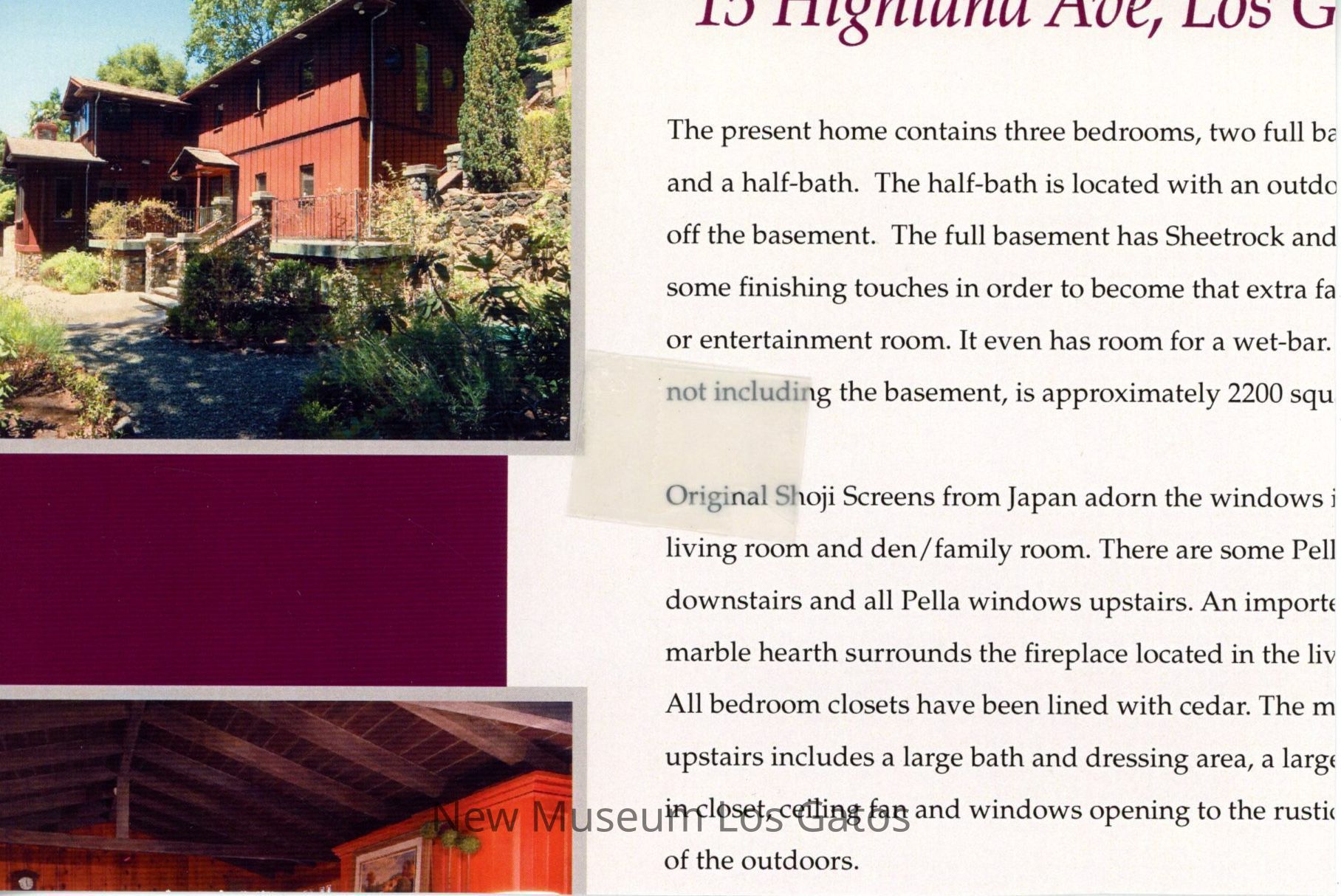 A color photograph of 15 Highland Avenue in Los Gatos. The dark-colored house features stone details along the base, the steps, and the chimney. There is a driveway in front, to the right of the house, with trees behind the house to the left. The photograph is printed on thick, glossy paper, and was most likely from a sale flyer.Photograph Details