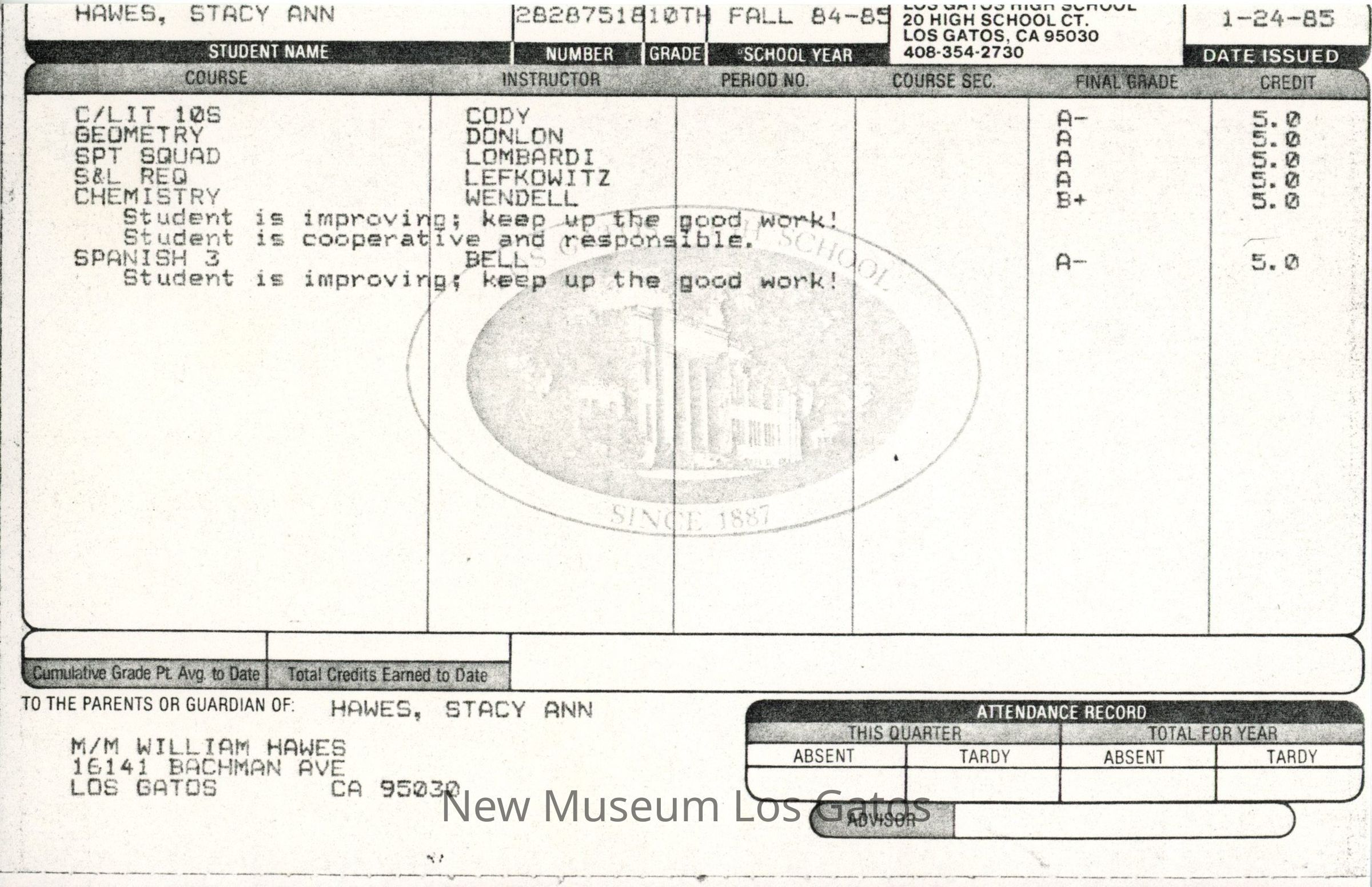A single, half sheet of paper with Stacy Hawes' grades in her first semester of 10th grade at Los Gatos High School. On the original, the pre-printed boxes and information is blue, while the typed information relevant to Stacy is in black ink. On the copy, everything is black or grayscale.Creator