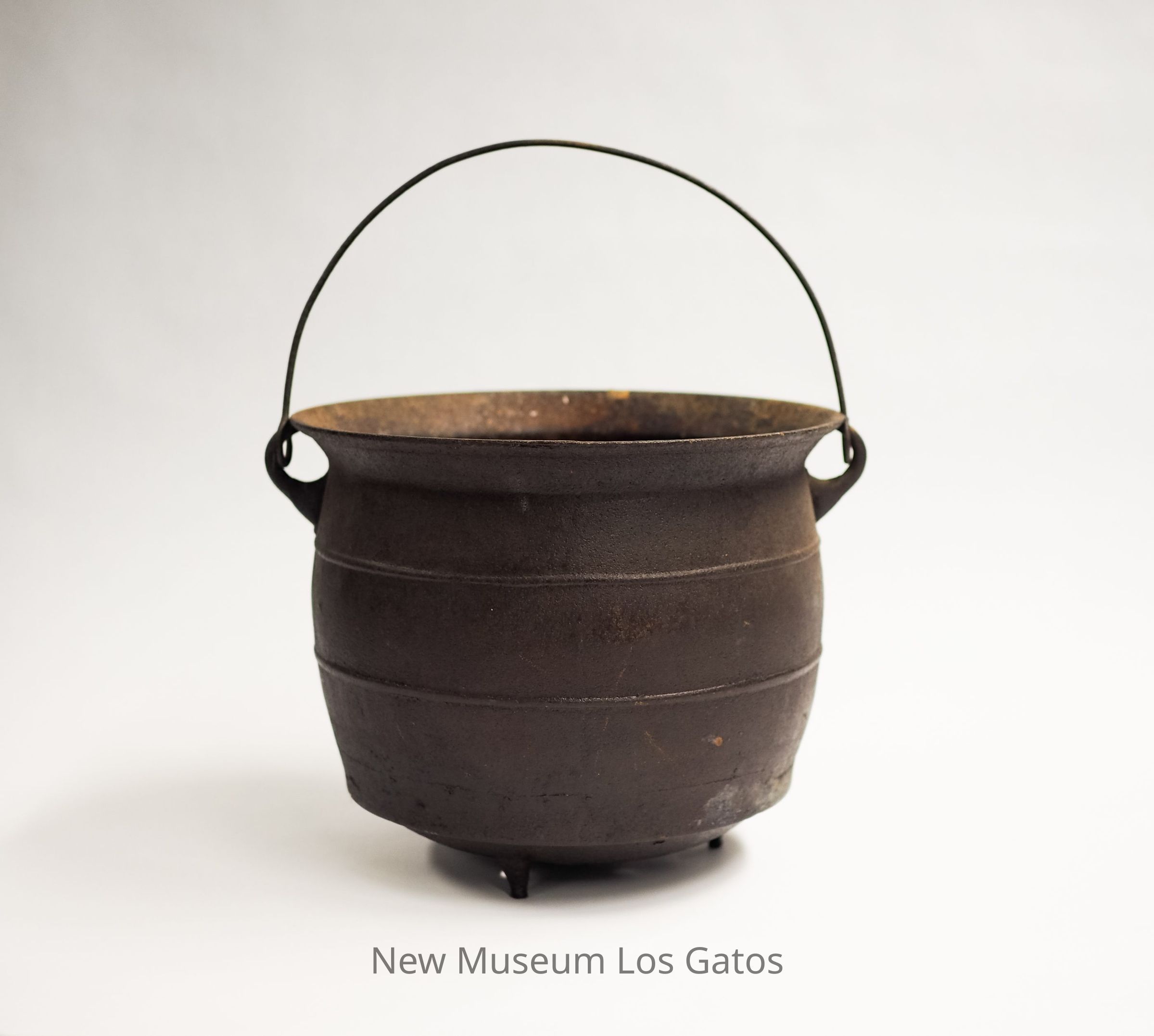 A large, three-legged iron kettle. The legs are short, and there are two circular bands around the circumference of the pot. There is also a thin iron handle attached to both sides of the potCollection