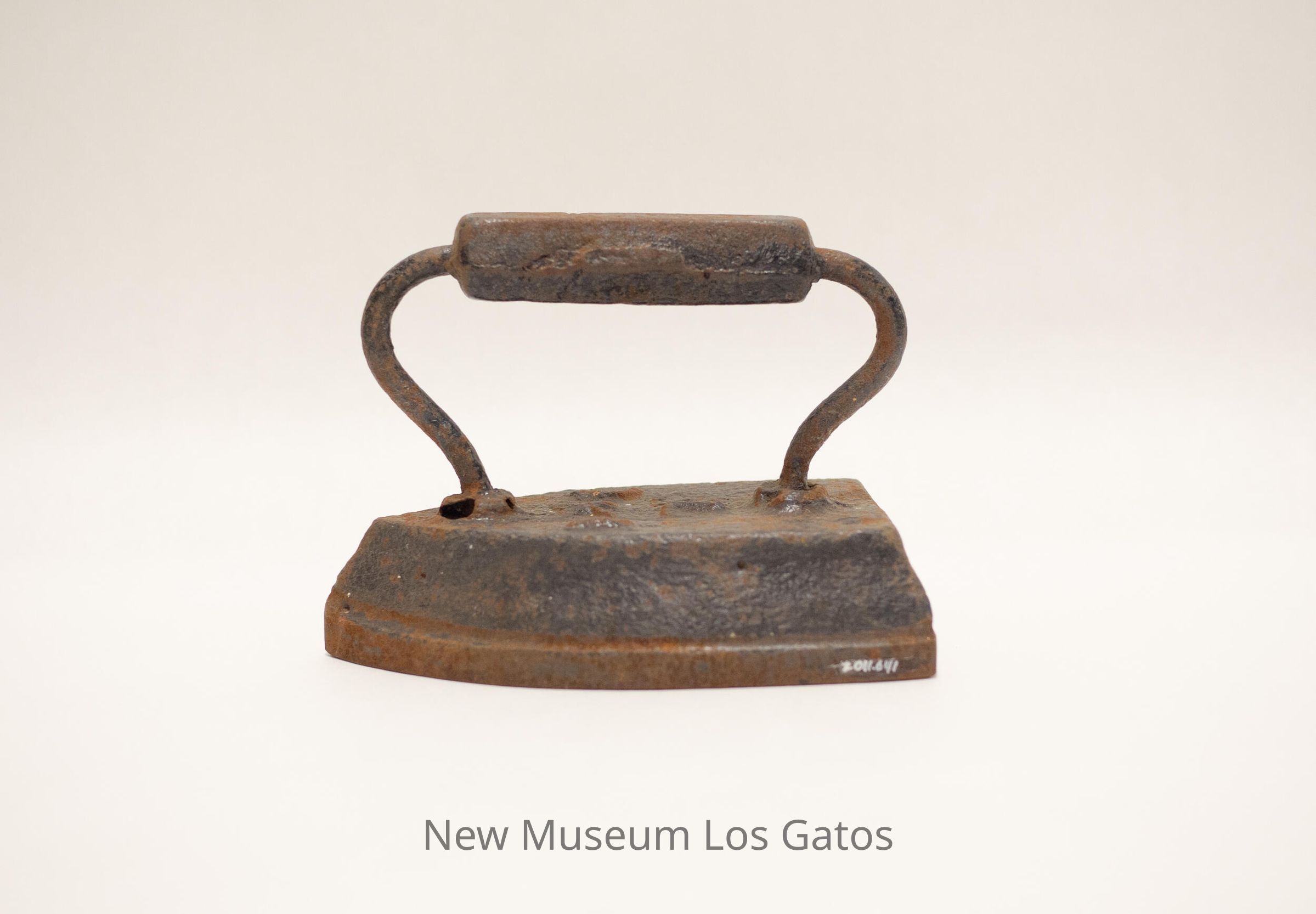 A heavy iron with an attached handle. Both iron and handle are made from metal, most likely cast iron.