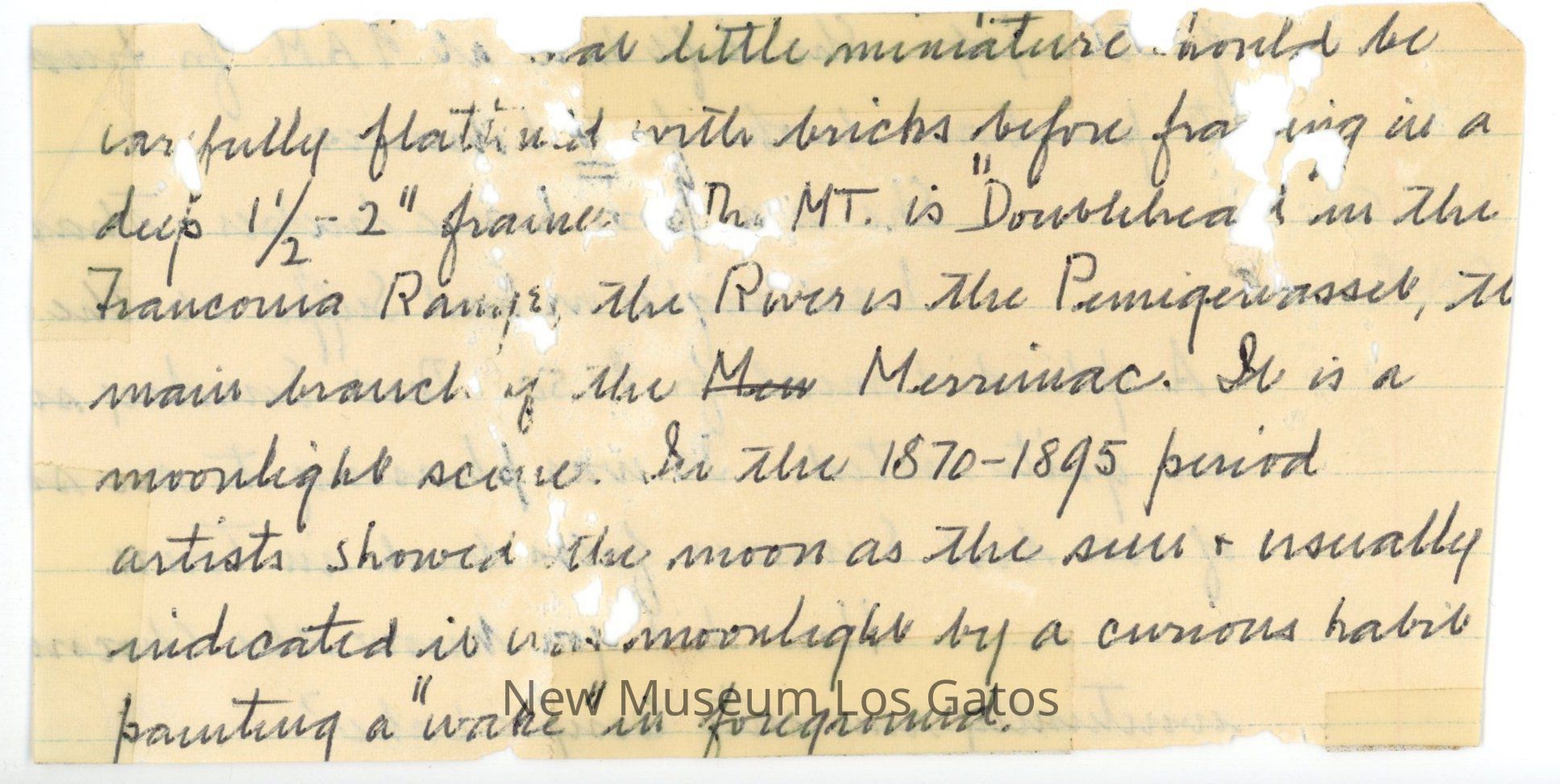 There is an envelope taped to the back with three pieces of paper. One piece is a tattered piece of lined paper with hand written text on both sides. The other two are photocopies of one side of the original paper.Type of Painting