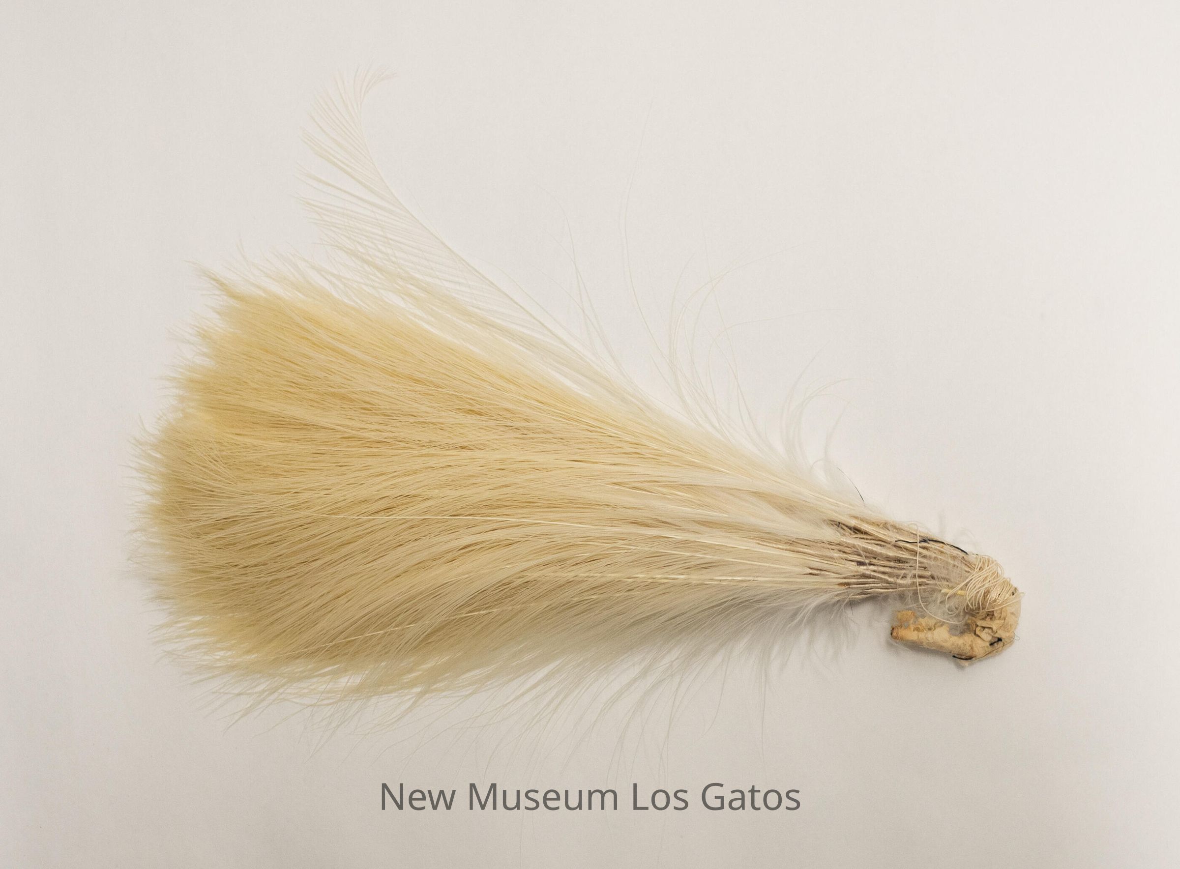 A feather decoration consisting of numerous white tail feathers bound together at their base. The bases are wrapped in white string, and bent to form a hook shape.
