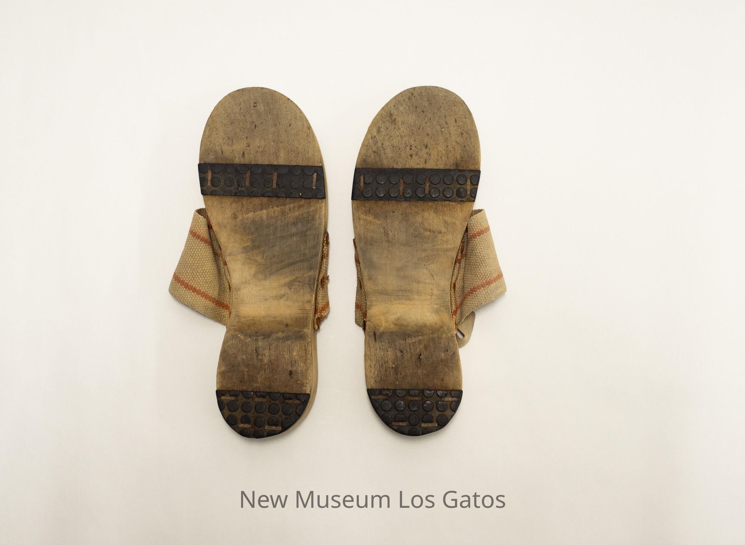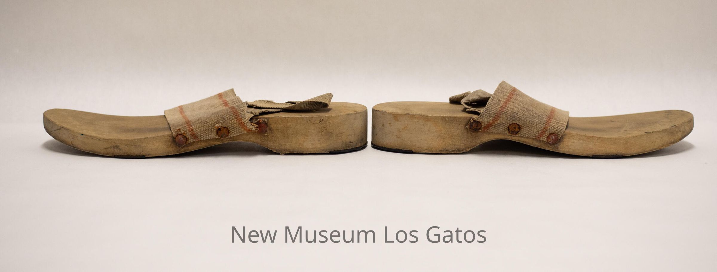 A pair of wooden shower clogs, of military issue. Clogs have an over-the-foot strap with two red stripes, as well as a thin heel strap. On the bottom of the clogs are two strips of rubber, to prevent slipping.Collection