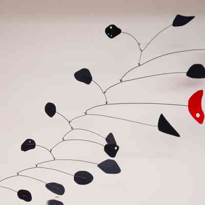 A sheet metal and wire hanging mobile sculpture, consisting predominately of black sheet metal shapes and one red sheet metal shape, attached to black black wires, which hang from each other in an abstract pattern.Type of Sculpture