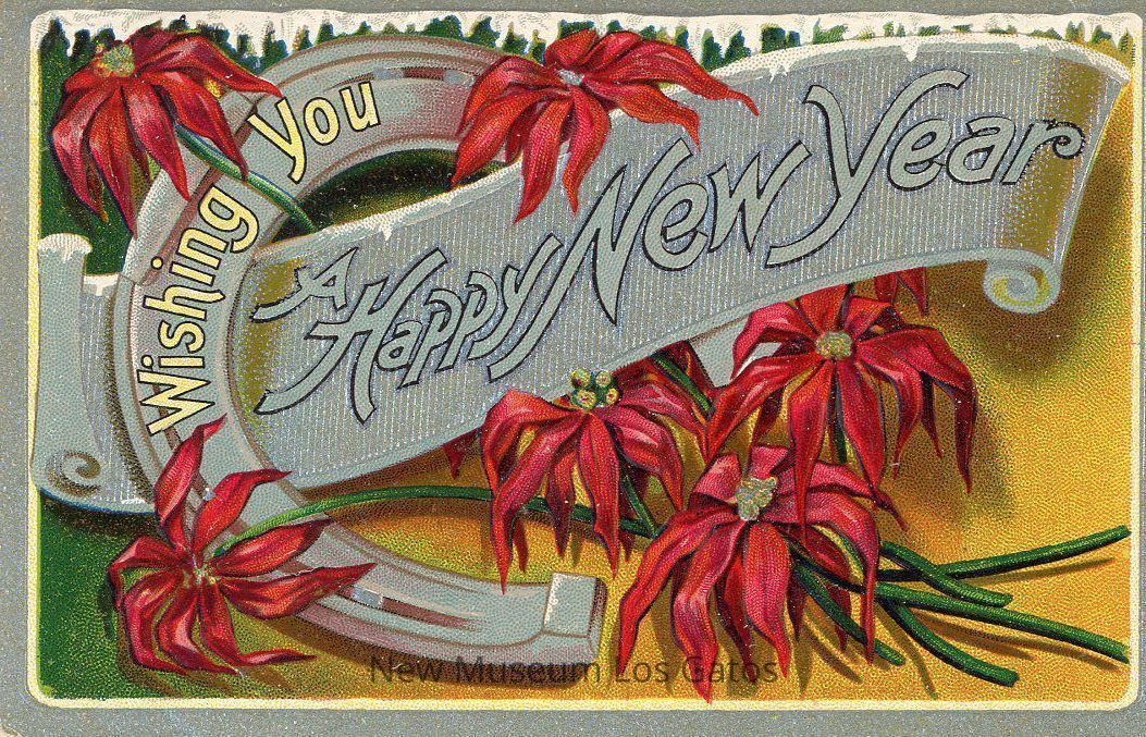 A postcard celebrating New Years, with illustrated red flowers, a silver ribbon, and silver horseshoe depicted.Subject