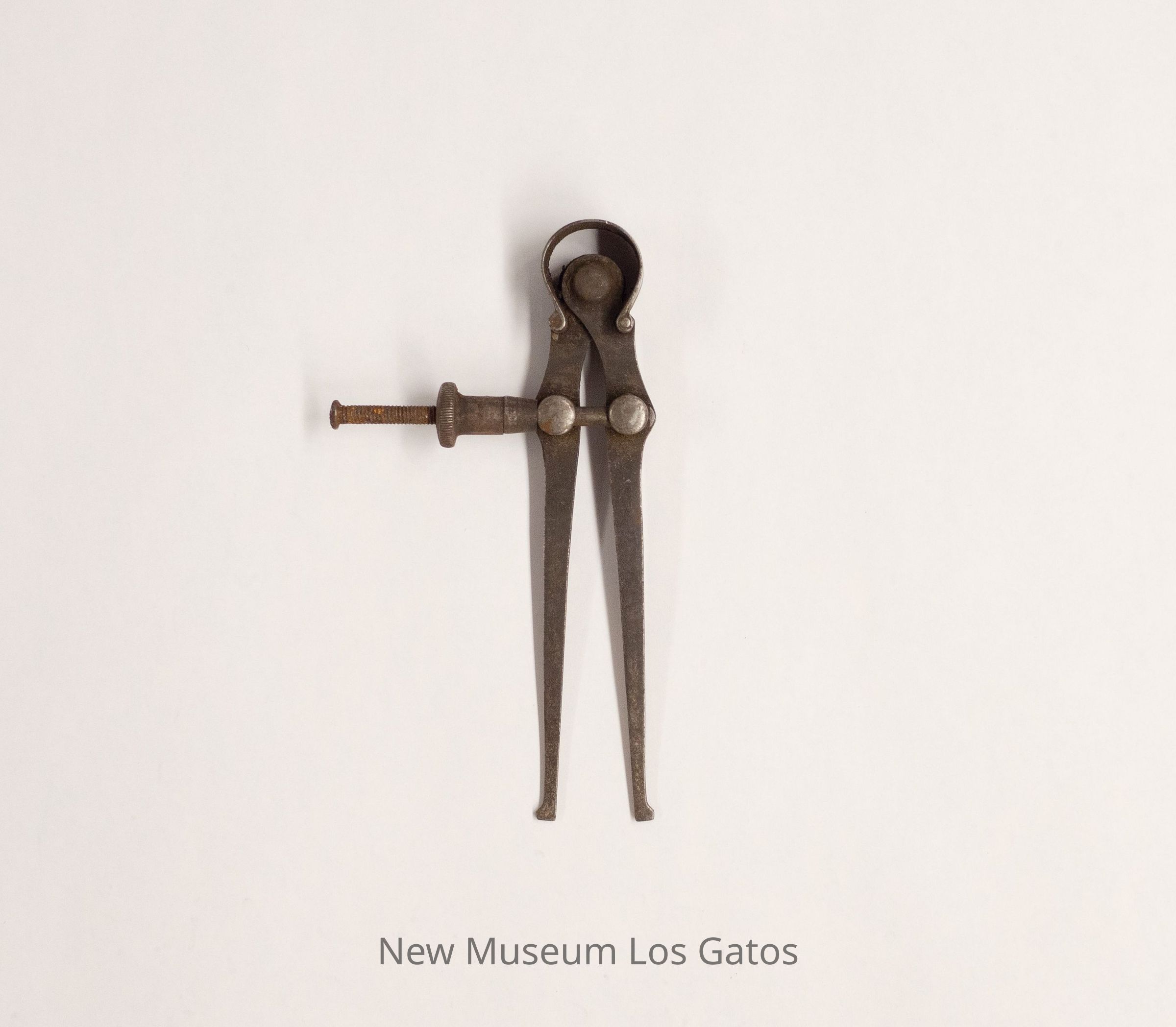 A pair of small metal rods that taper outwards slightly at the bottom. The rods are held together at the top by a joint, which is inside another curved piece of metal. There is a screw mechanism attached to both rods that open and closes the caliper.Collection