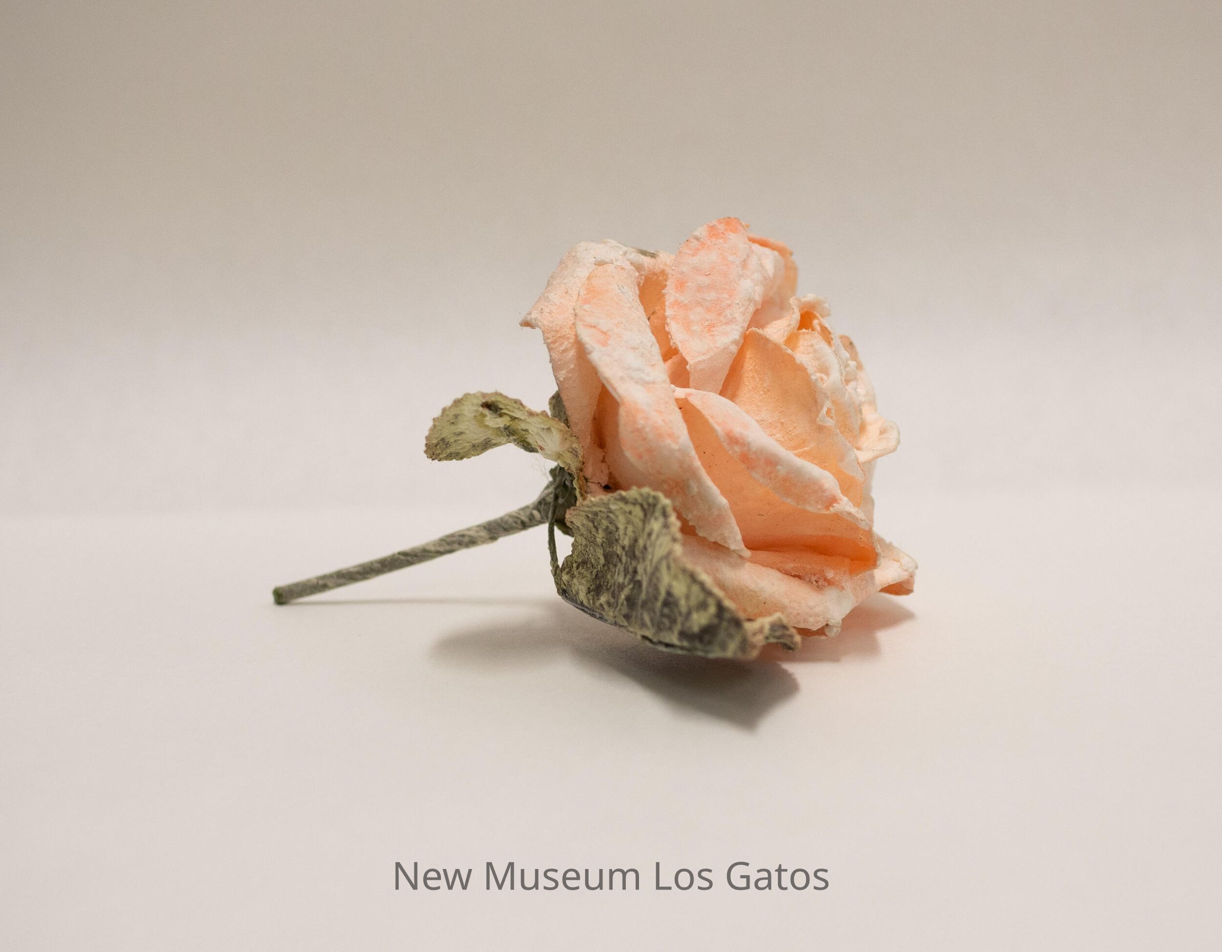 A synthetic pink rose, with a green stem and two green leaves, that appears to be made out of some sort of hardened paper material. There is a white coating over the majority of the rose, that appears inherent to the object.