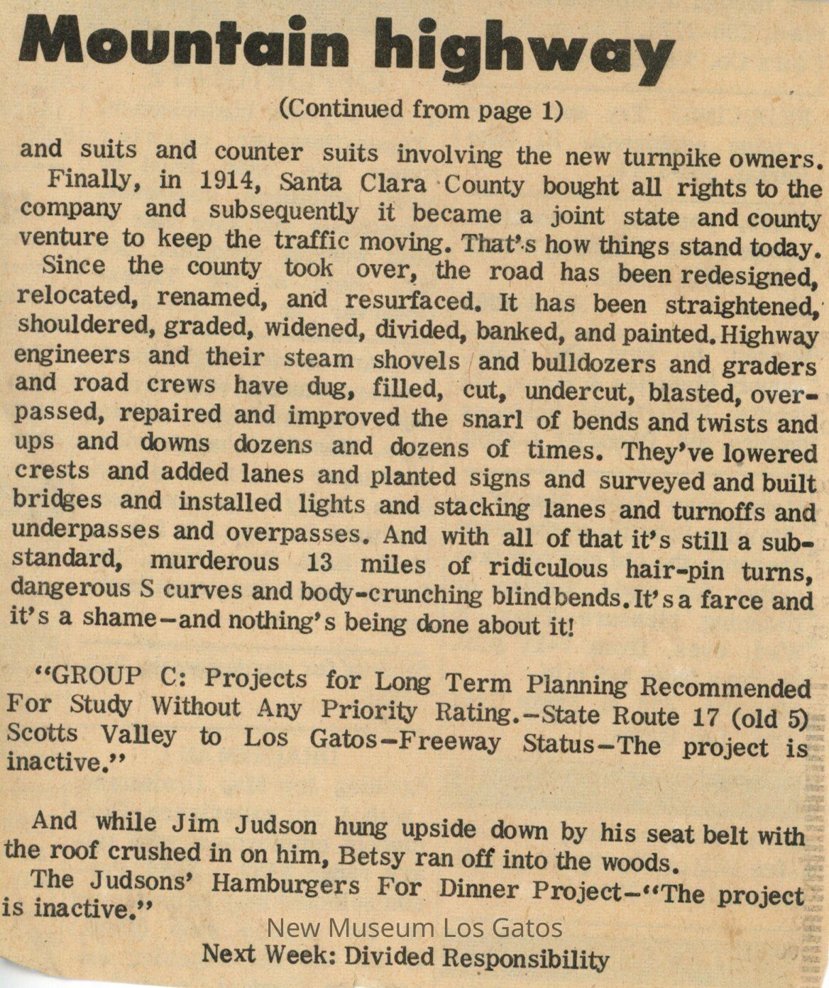 Small newspaper clipping with an article about Highway 17, from Los Gatos to Santa Cruz, California.Collection