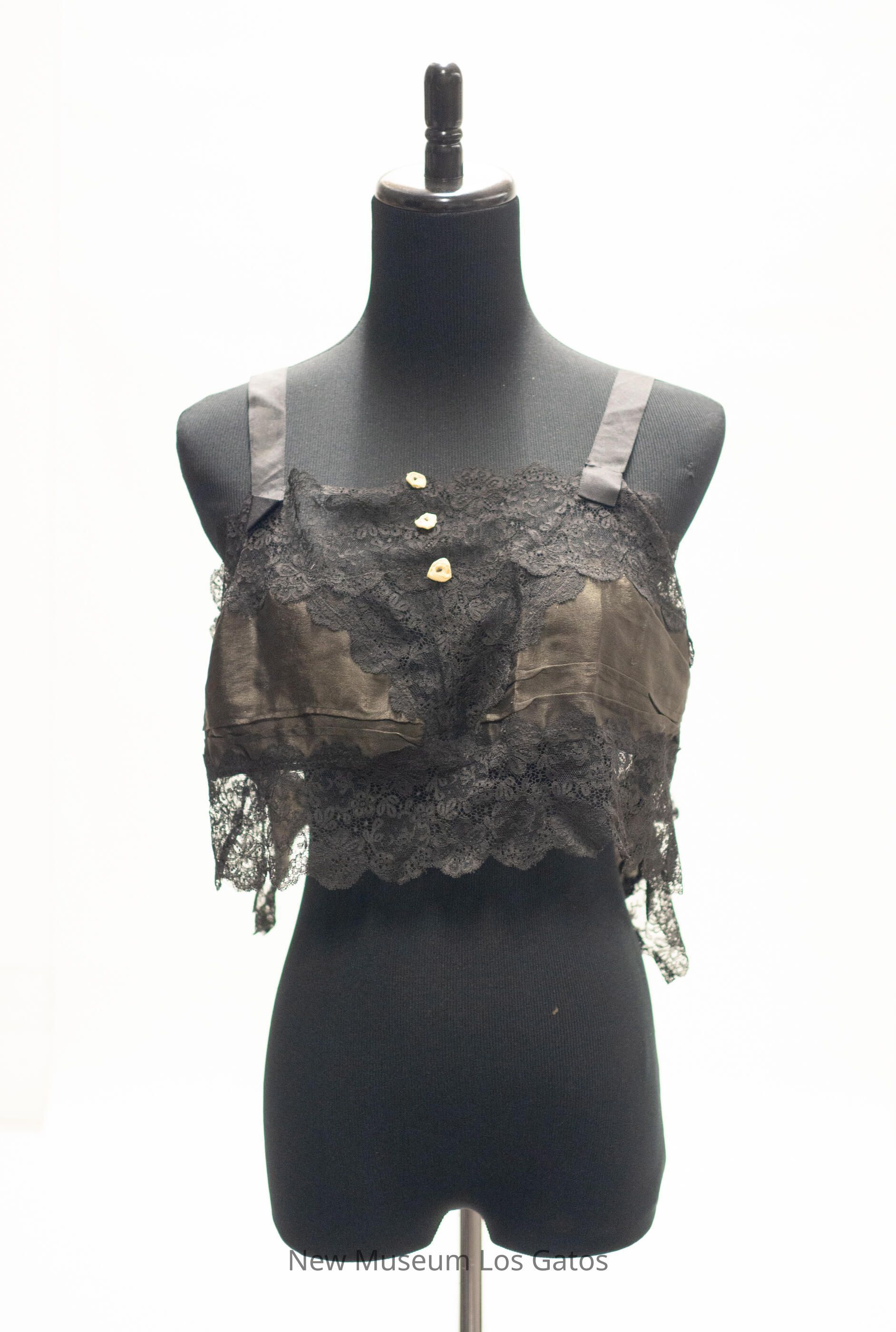 A black, silk corset top with black lace trim. The silk is in the center of the top, with floral black lace along the top and bottom of the silk. The straps are also black silk. There are three small, cream-colored decorative silk flowers in the center-top of the corset top.Collection