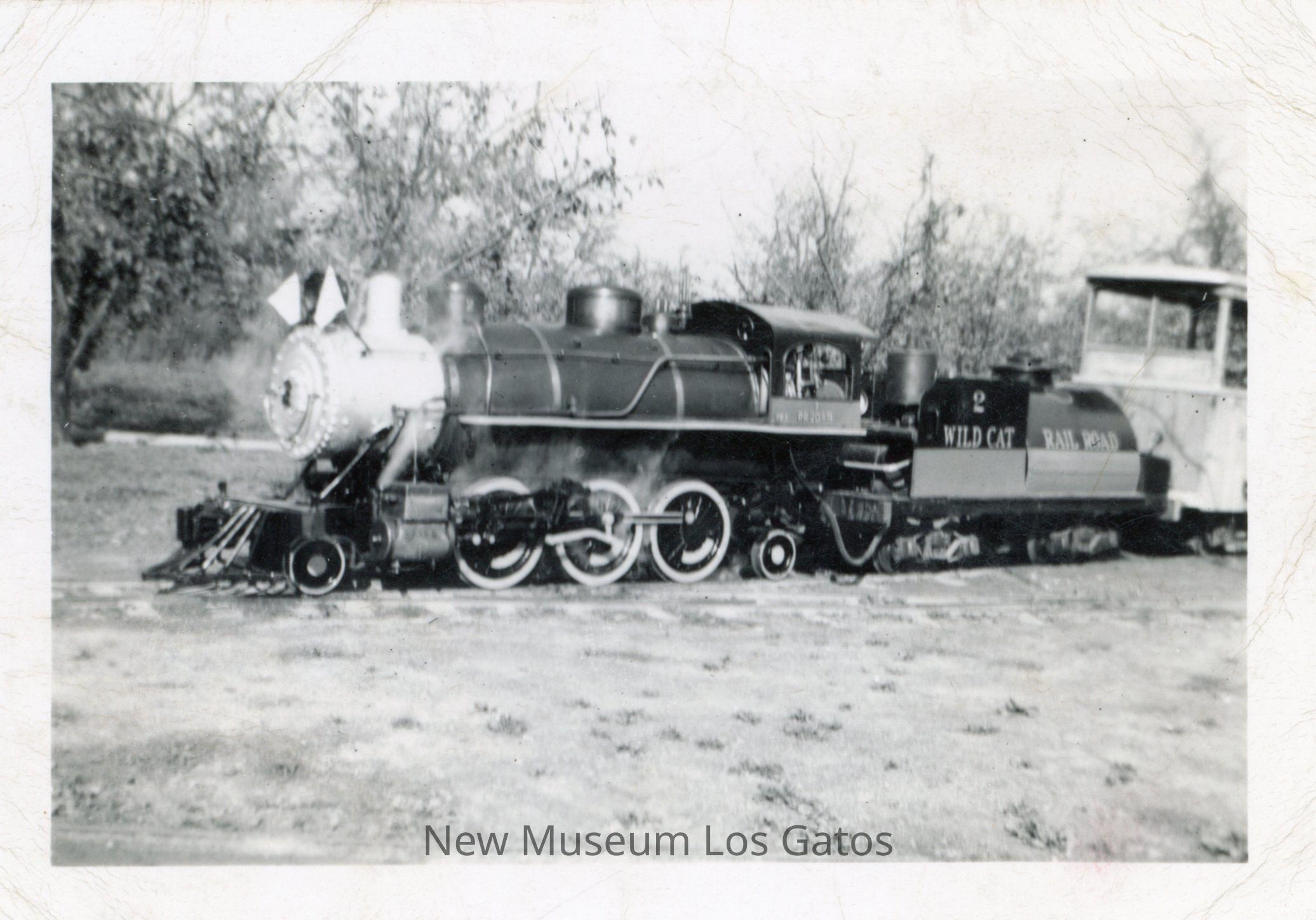 A black and white photograph featuring the Wildcat Railroad train. The steam engine and the front section of the first car are visible, coming into the image from the right. The ground is flat and barren, and there are trees in the background. The image is slightly blurry, and is surrounded by a white border.Collection