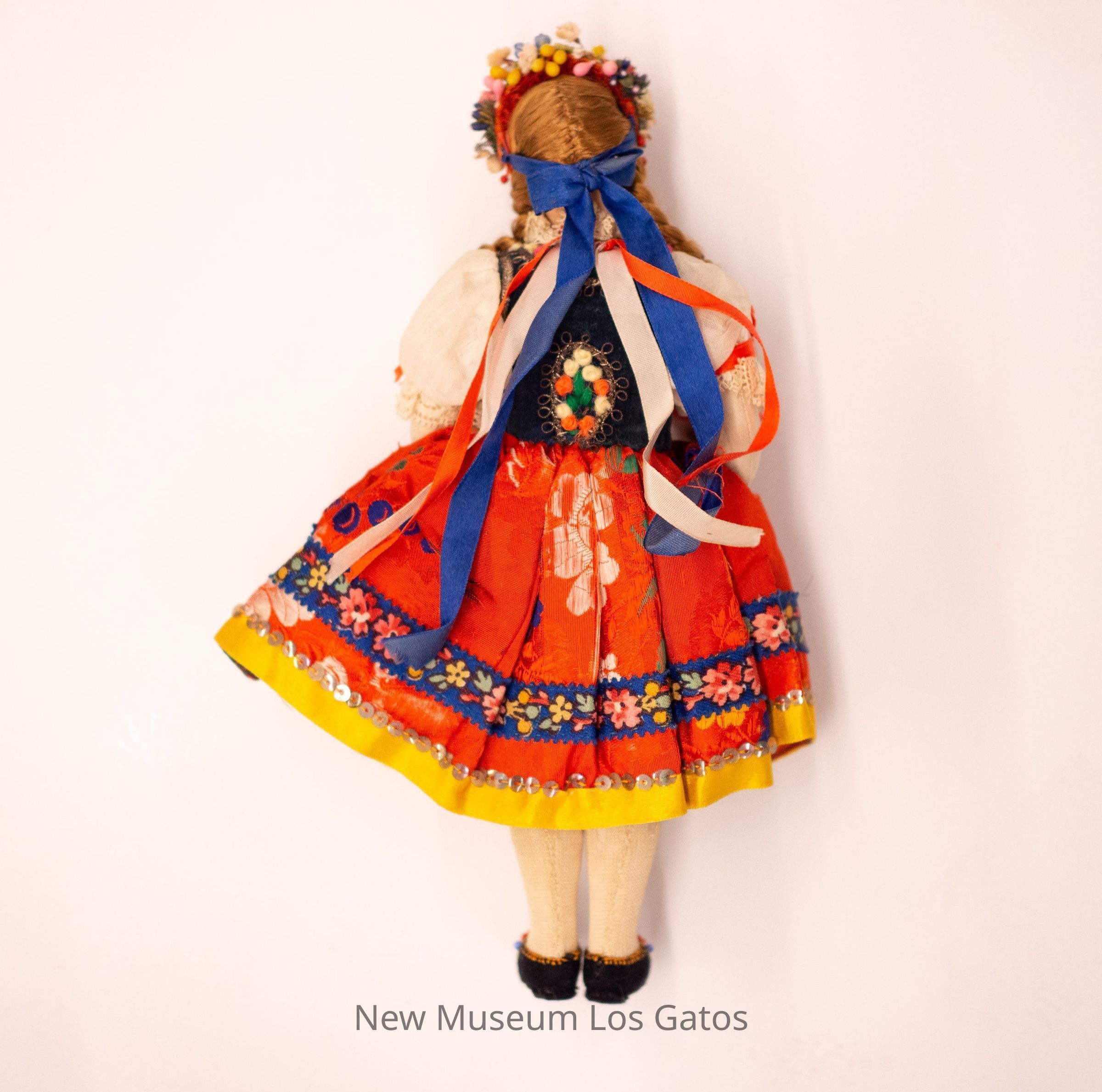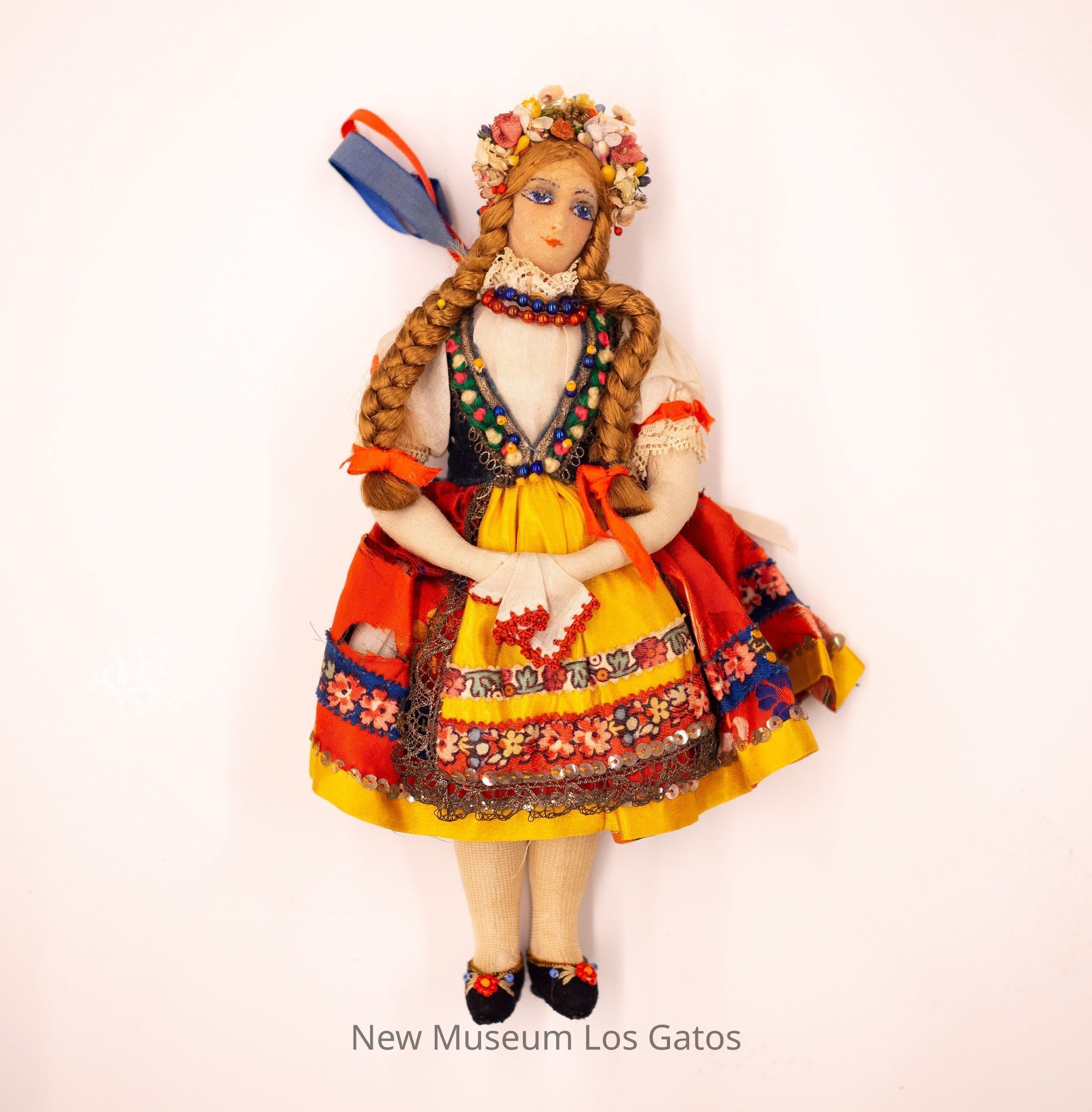 A female fabric doll in a folk dress, possibly Baltic or Russian in style. The doll is in an intricately decorated red and yellow skirt, lined with sequins and flowers. The bodice is white and covered in a black vest with pink and white flowers, and blue and gold beads. The doll is wearing red and blue beaded necklaces. The doll's hair is reddish-blonde, in two long braids tied with a red ribbon at the ends. The doll is wearing a crown of fabric and faux plastic flowers on her head, and has a headband made of red blue and white ribbons. The doll is wearing black shoes with embroidered flowers. The doll's hands are clasped together at her waist with a white and red handkerchief over them. The doll's eyes are blue and her lips are red, painted onto the fabric.Collection