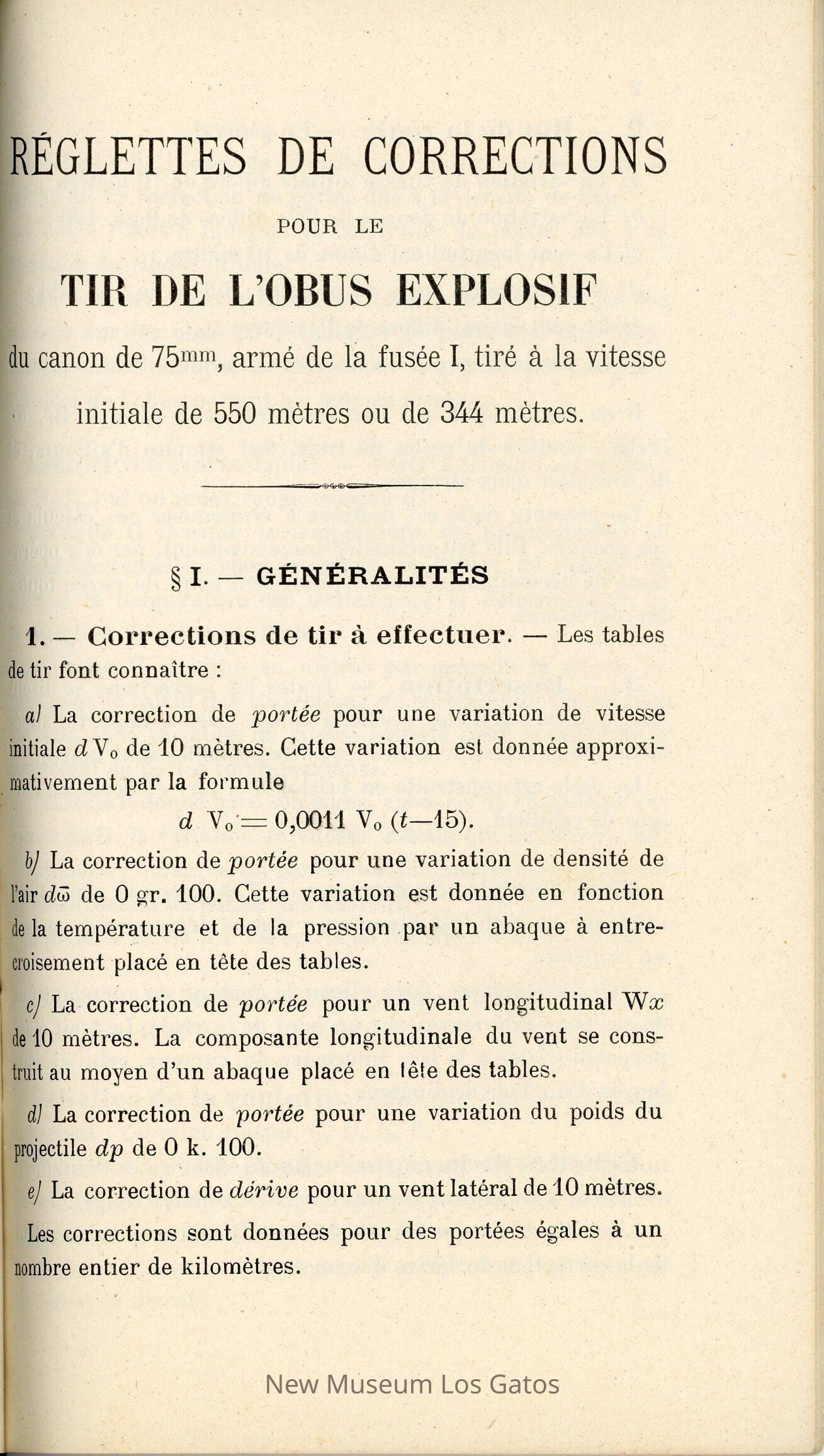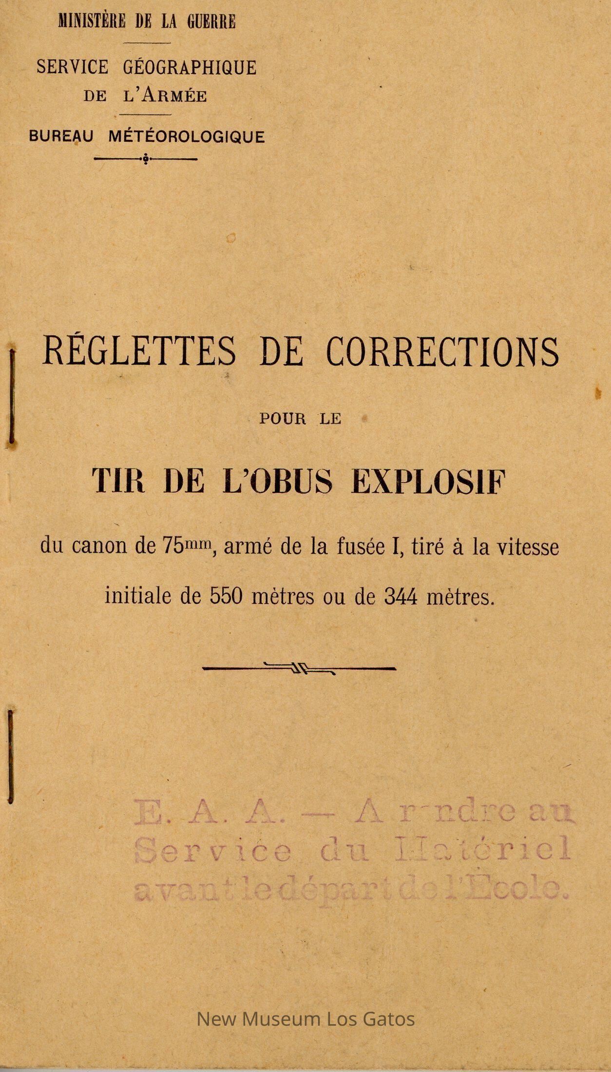 "Correction Rulers for Firing the High Explosive Shell," a French manual from World War I.Collection