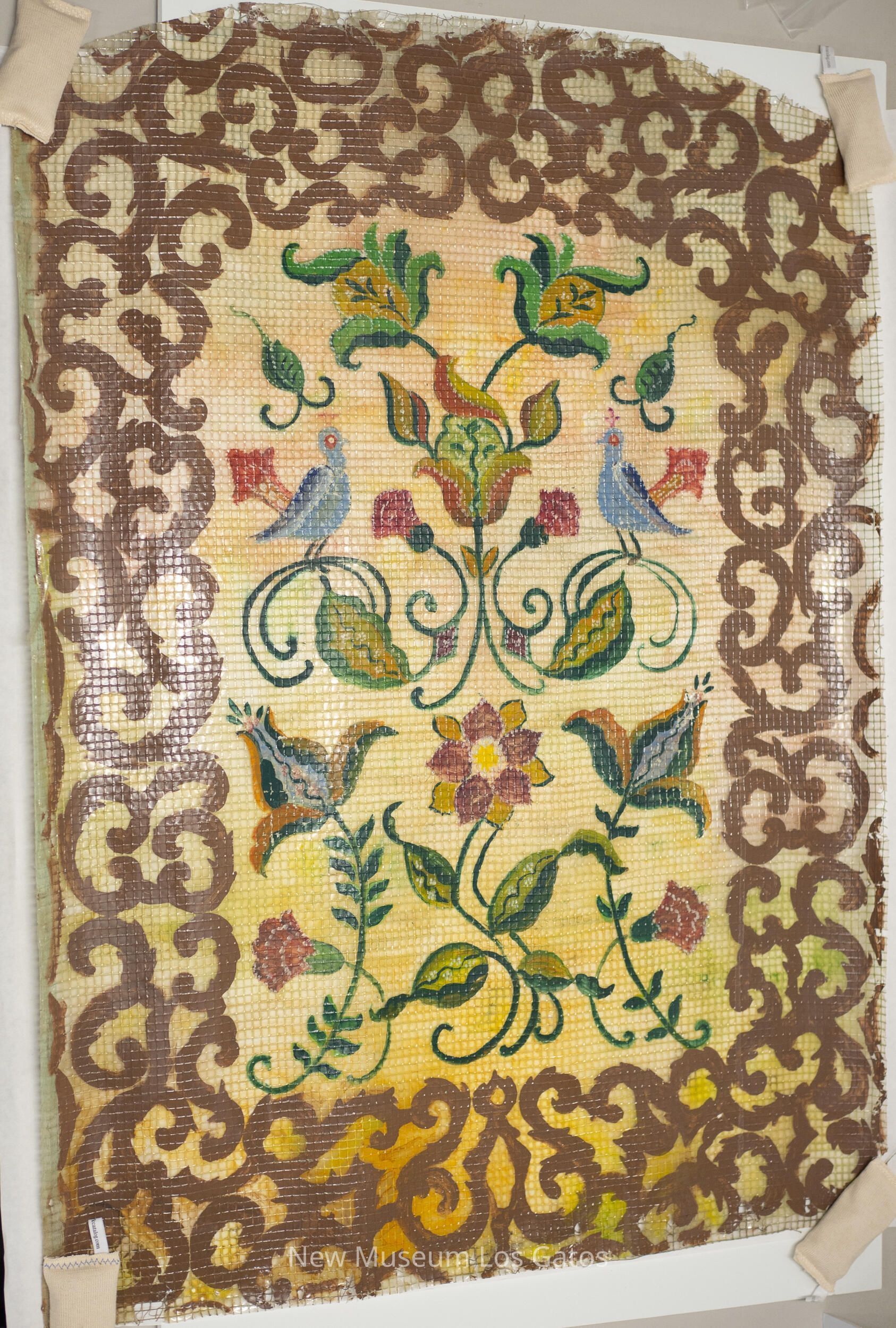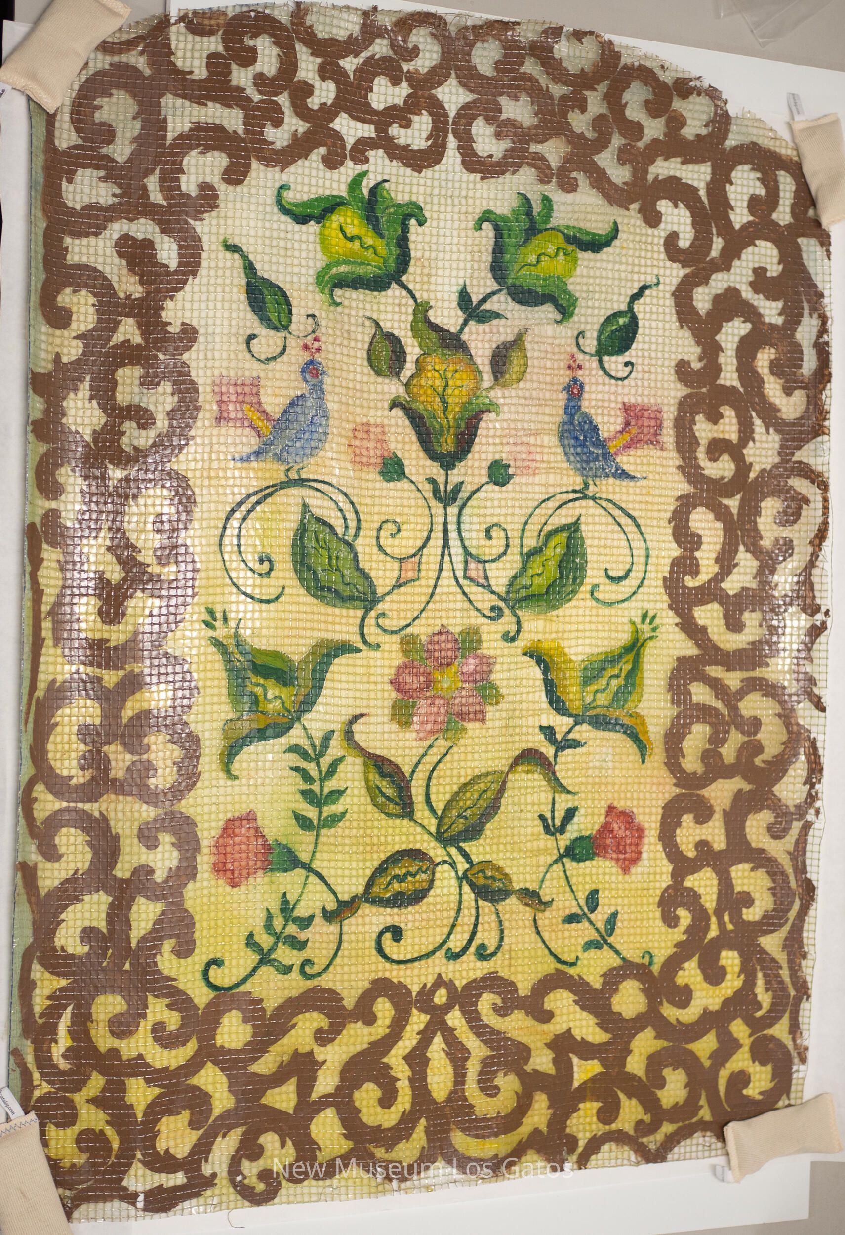 There are two versions depicting the same scene: a brown, swirled border around a scene depicting two birds and flowers. There is a red and yellow flower in the center bottom, flanked by two blue and orange flowers with smaller red flowers amongst the vines. In the center is a large red, yellow, and green flower with smaller red flowers and green and yellow pods on each side. There are also blue birds with red tail feathers, resembling quails, on either side of this center flower. At the top are two yellow flowers with green vines. These paintings are painted on a plastic-like mesh substrate.Type of Painting