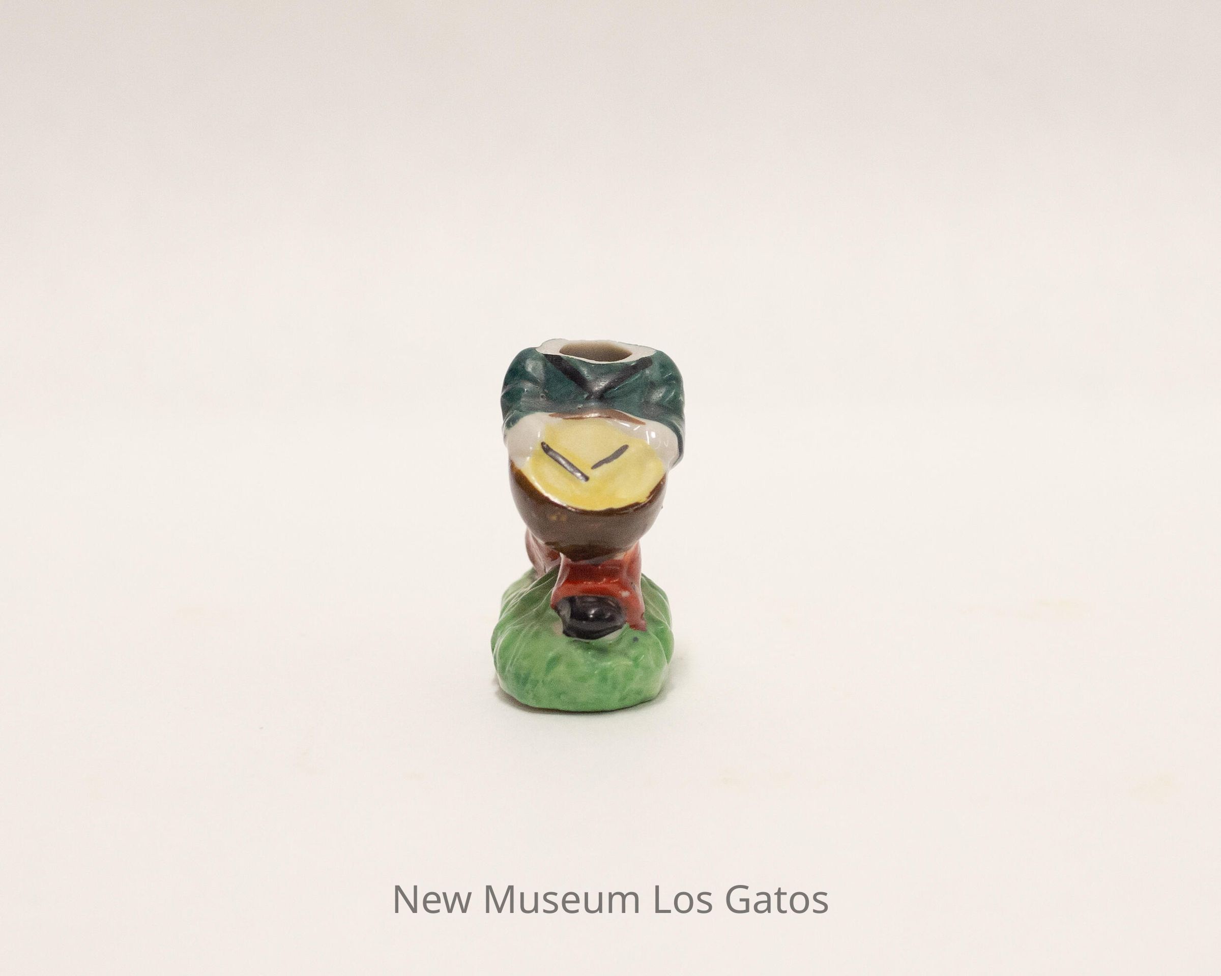 Small, porcelain painted figurine of a drummer. The drummer is wearing a tall blue hat, a dark green shirt, red pants and black shoes. The drum is brown, with a yellow top and black drumsticks. The drummer is standing on green grass.Collection