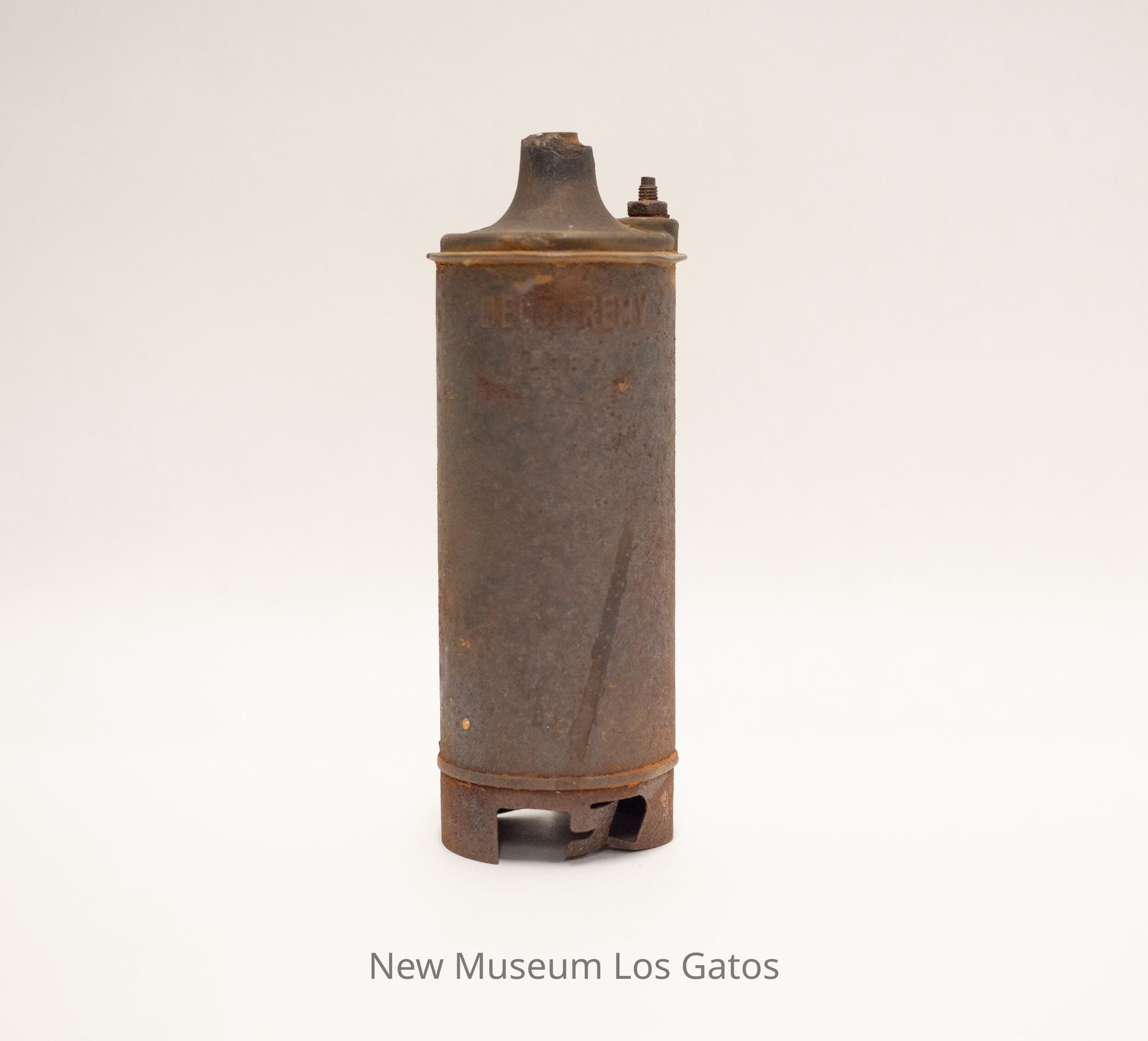 An ignition coil for a bean sprayer, which consists of a small cylindrical piece with a conical top. There is also a distributor cap for a bean sprayer, consisting of a black, circular piece with five attached rubber hoses.Collection