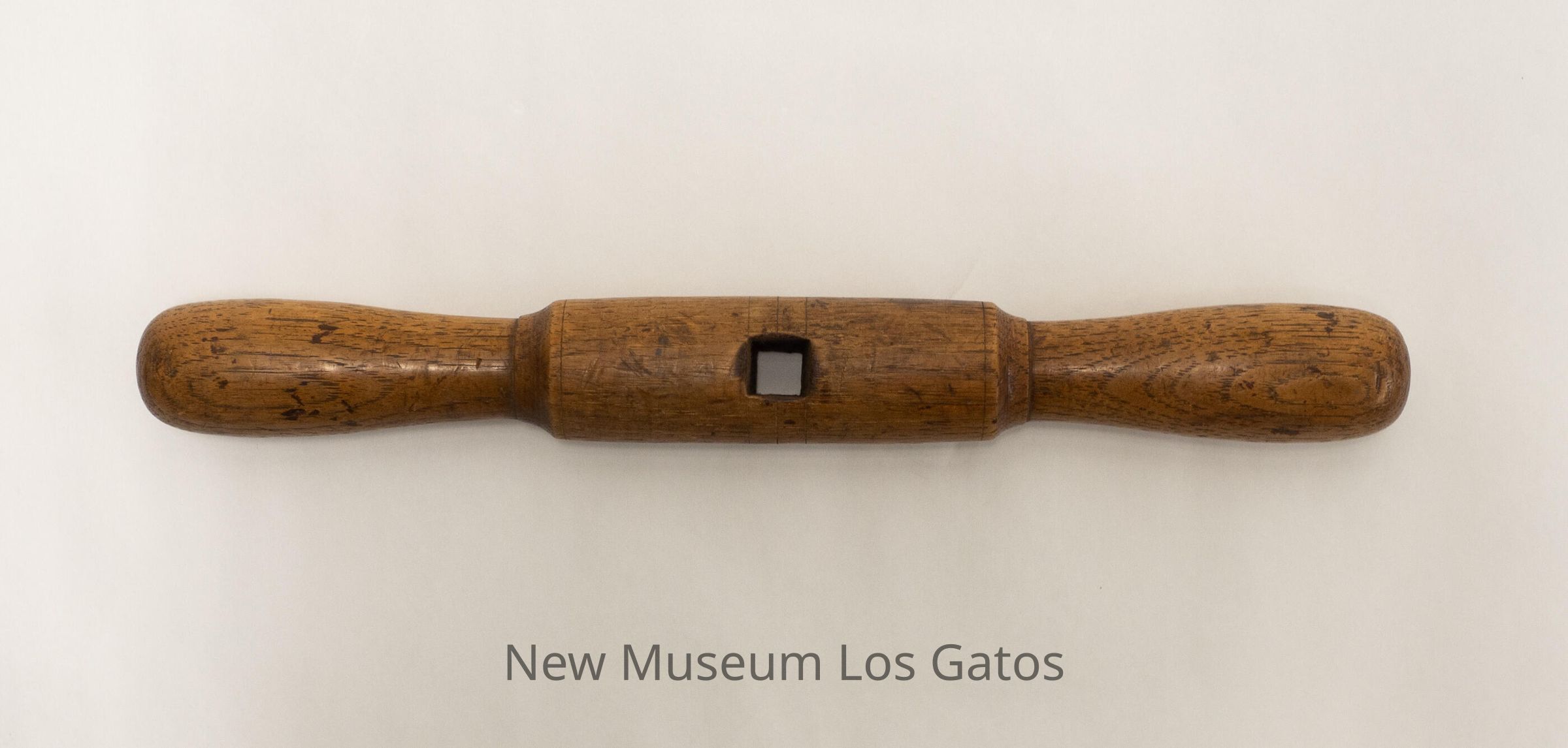 A wooden handle, with a cylindrical center and two slightly tapered hand-holds. There is a square hole through the center of the handle, where it previously attached to the rest of its tool.Collection
