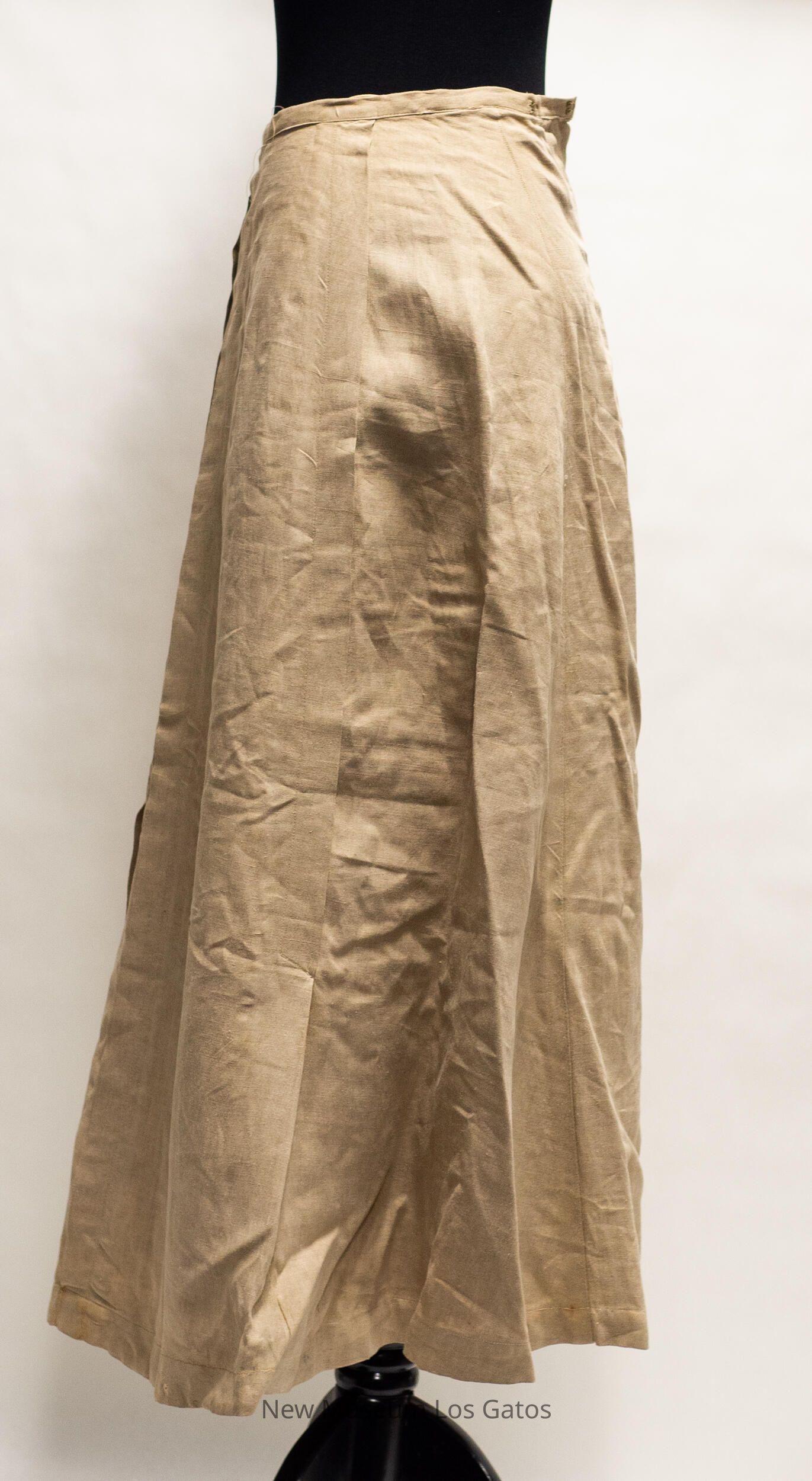 A long, beige linen walking skirt. There are three large pleats, one in the front and one on each side. The interior seams are edged with light yellow fabric. The back of the skirt opens part way down, and closes with small golden hook and eye clasps.Collection