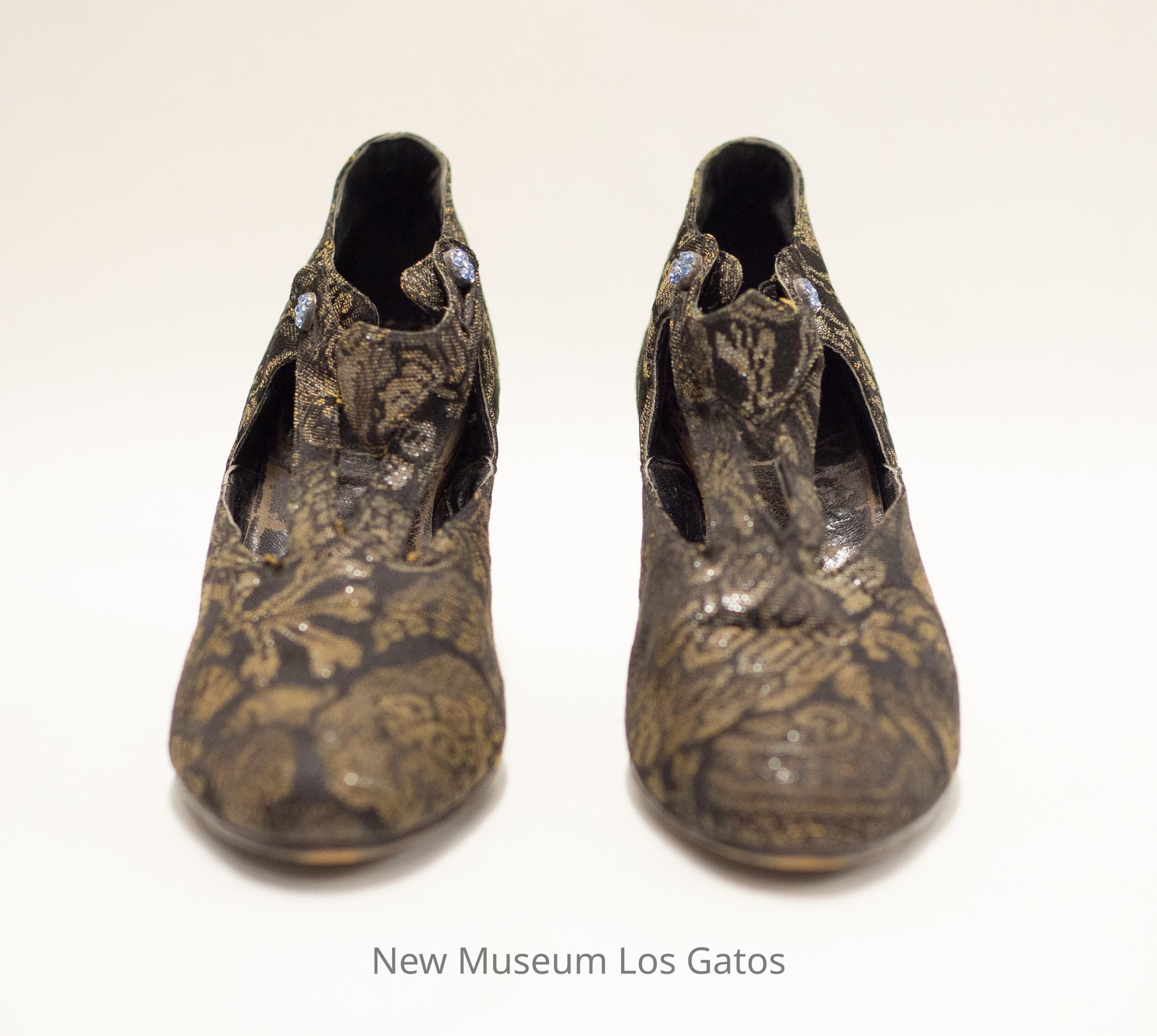A pair of black and gold brocade heels. There are two vertical straps on the front of the heels that attach to a third, horizontal strap around the ankles. The horizontal strap is secured to the shoes on both sides by jeweled button.