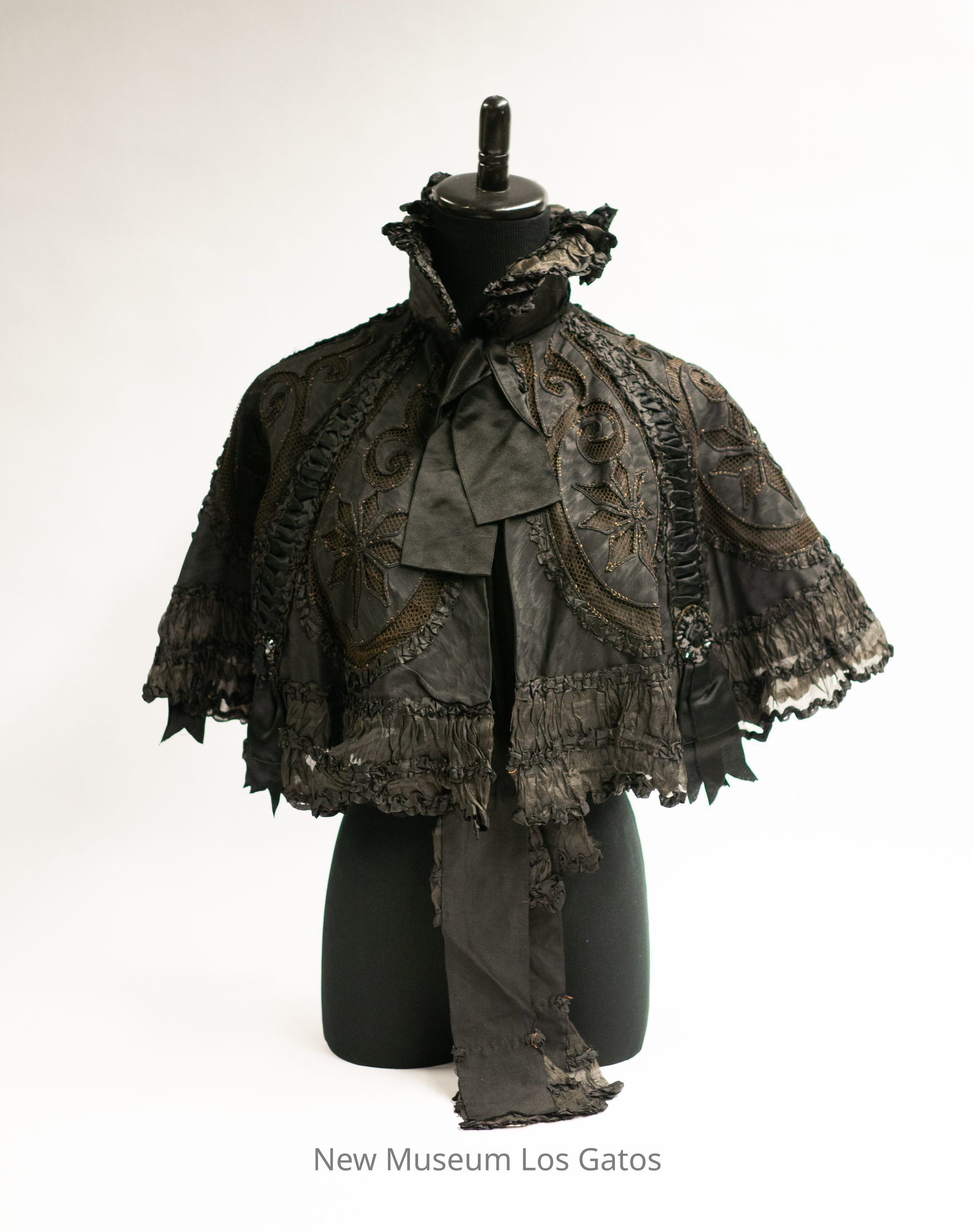 A black silk mantle with a ruffled collar. The cape has ruffle detailing along the bottom hem, as well as in numerous vertical lines throughout the mantle. There are black sequin details and black ribbon at the ends of those vertical ruffles, with black silk flowers over black netting in between the ruffles.Collection