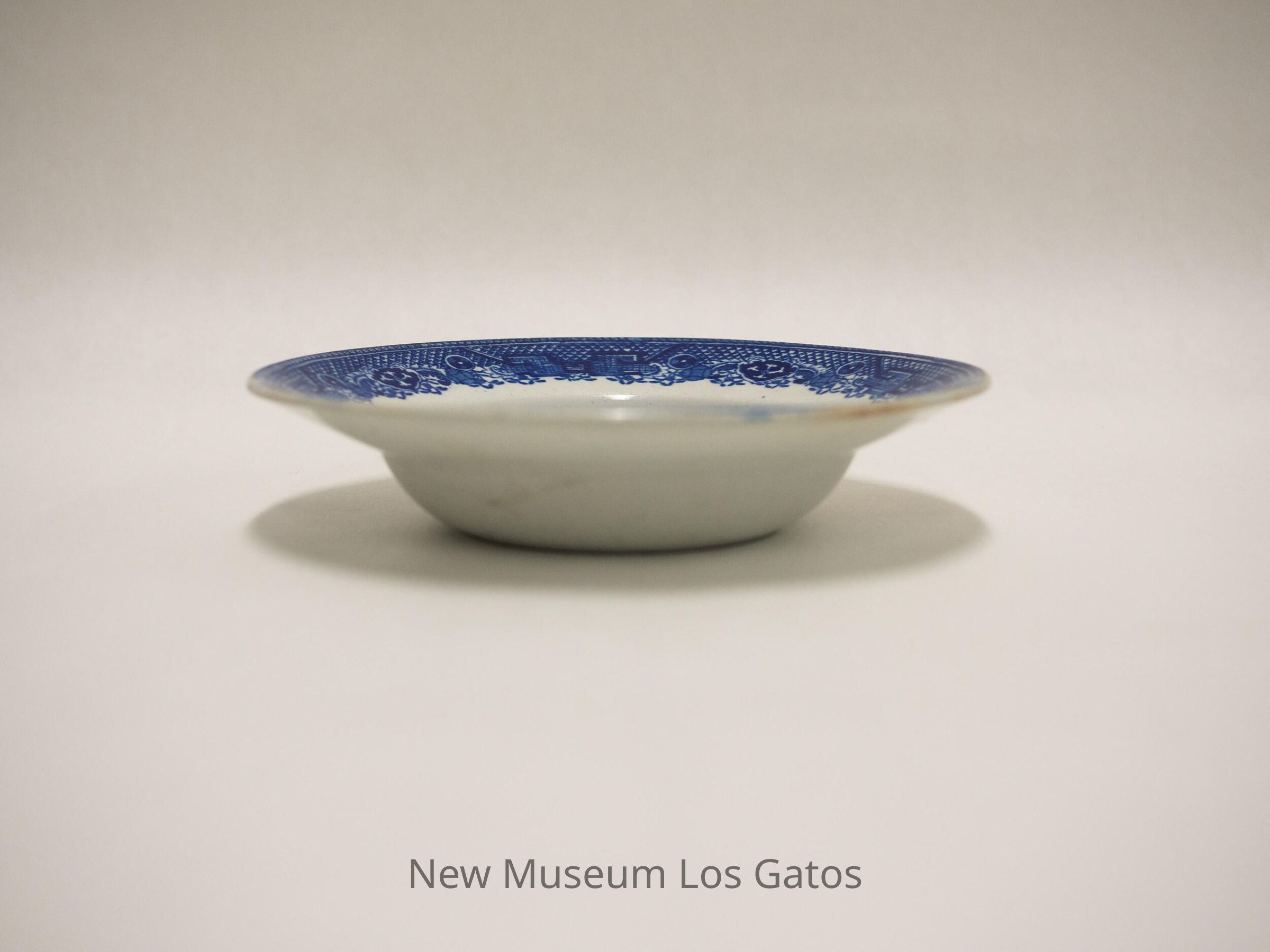 A white ceramic dish with blue patterning and decorations. Around the edge of the bowl, there is a geometric and flower pattern creating a border. On the inside of the bowl, there is a scene with multiple structures, people walking over a bridge, a fence, and a person sailing a boat down a river.Collection