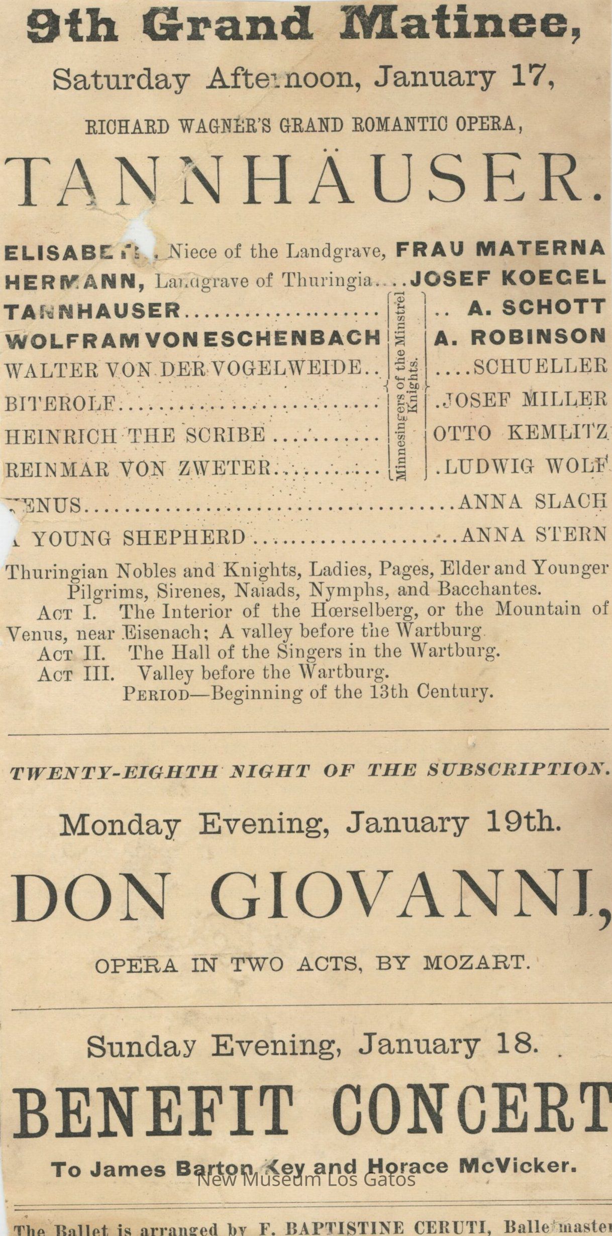 Single-paper program for the opera "Tannhäuser," dated January 17, 1885. The program lists the cast and settings for the acts. There is an additional advertisement for "Don Giovanni" and a benefit concert. There is a review for "La Juive" on the reverse side.Collection