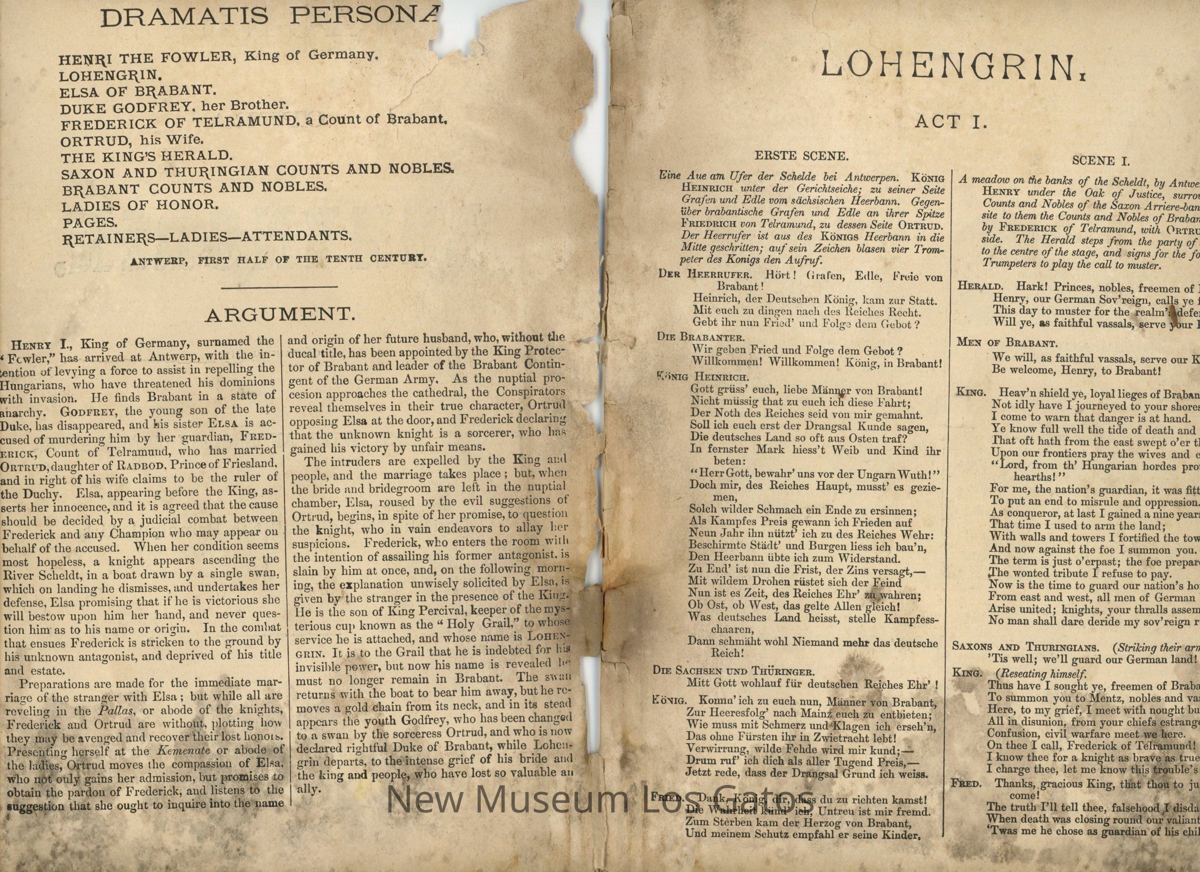 Paperbound program for "Lohengrin," presented at an unknown theatre, and unknown year. The booklet is missing the front and back covers. The program contains a plot summary, transcription in both English and German, and sheet music for the opera.Collection
