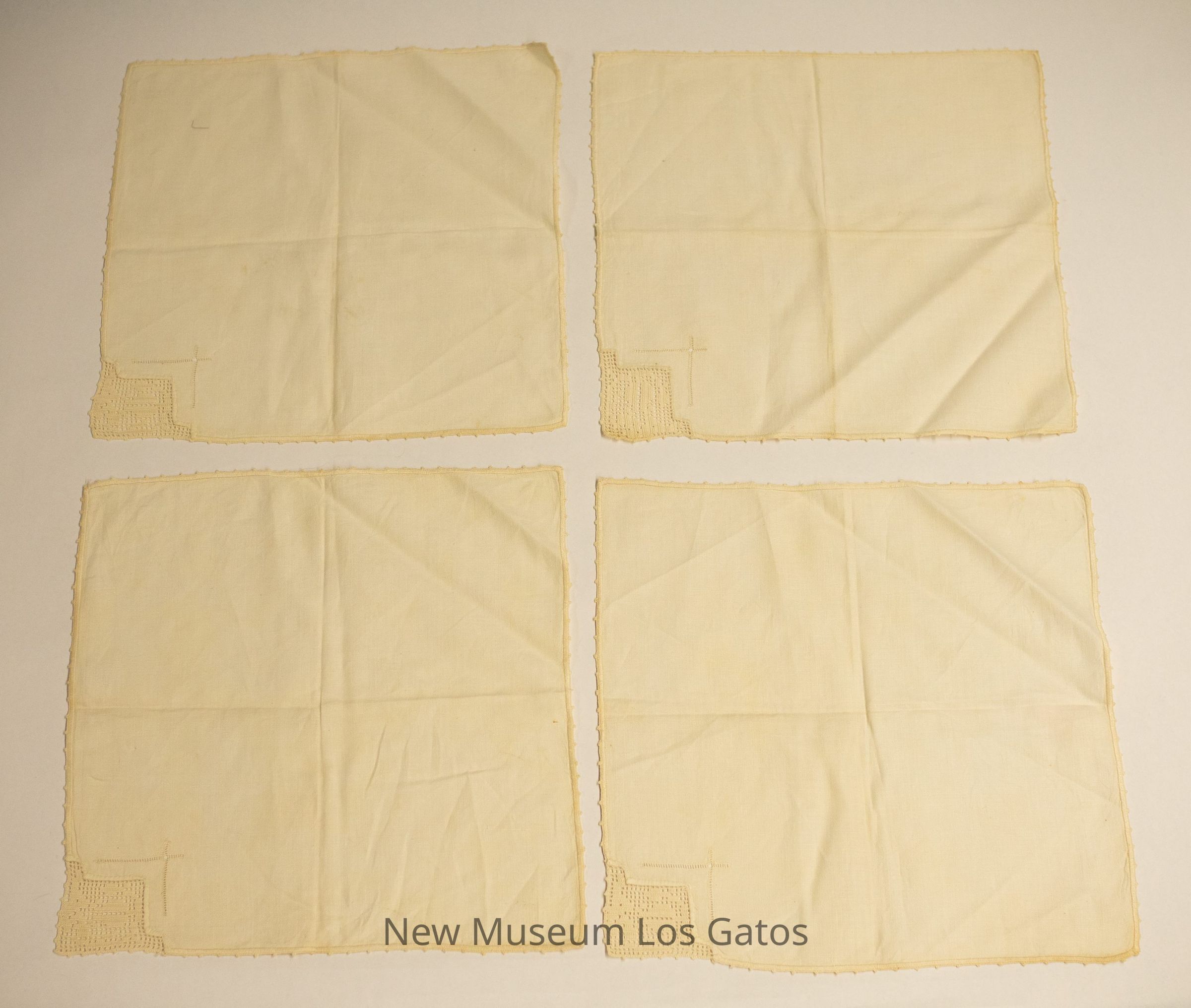 A set of four identical square, decorative napkins. Each napkin is ecru in color, and has embroidered edges with small dots. Each napkin also has a decorative, handmade corner with two lines of decorative eyelets accenting it.Collection