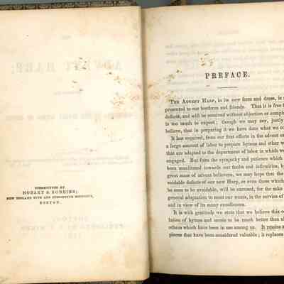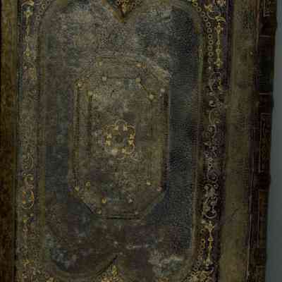 A small, black leather-bound book, featuring a collection of psalms and hymns. There are gold decorative swirls throughout both covers and the spine. The edges of the pages are gilded, and also feature an inlaid decorative pattern.Collection