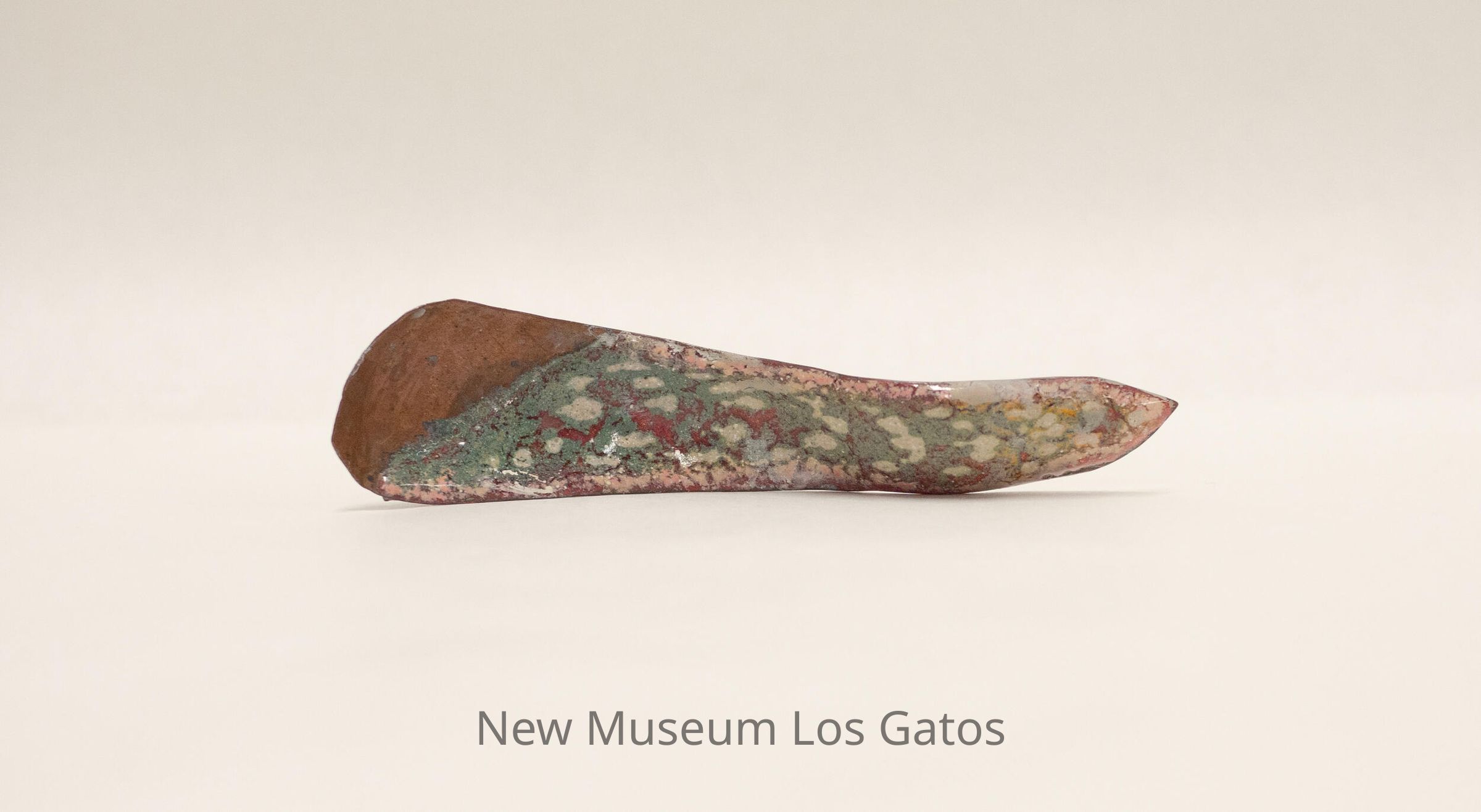 A skinny, curved piece of copper that is almost completely covered in colorful enamel. The enameled portions are green, red, pink, yellow, and white.Collection