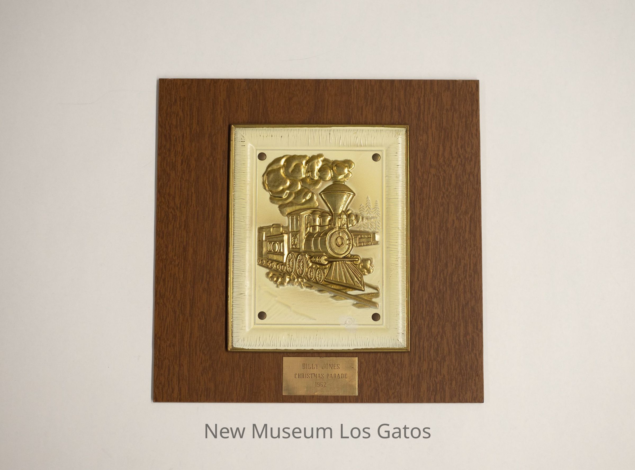 A square plaque, commemorating the 1962 Billy Jones Christmas Parade. The plaque consists of a square wooden base, with a rectangular center piece featuring an image of a golden train locomotive with a painted white background. There is a smaller square with the inscription below the train.Collection
