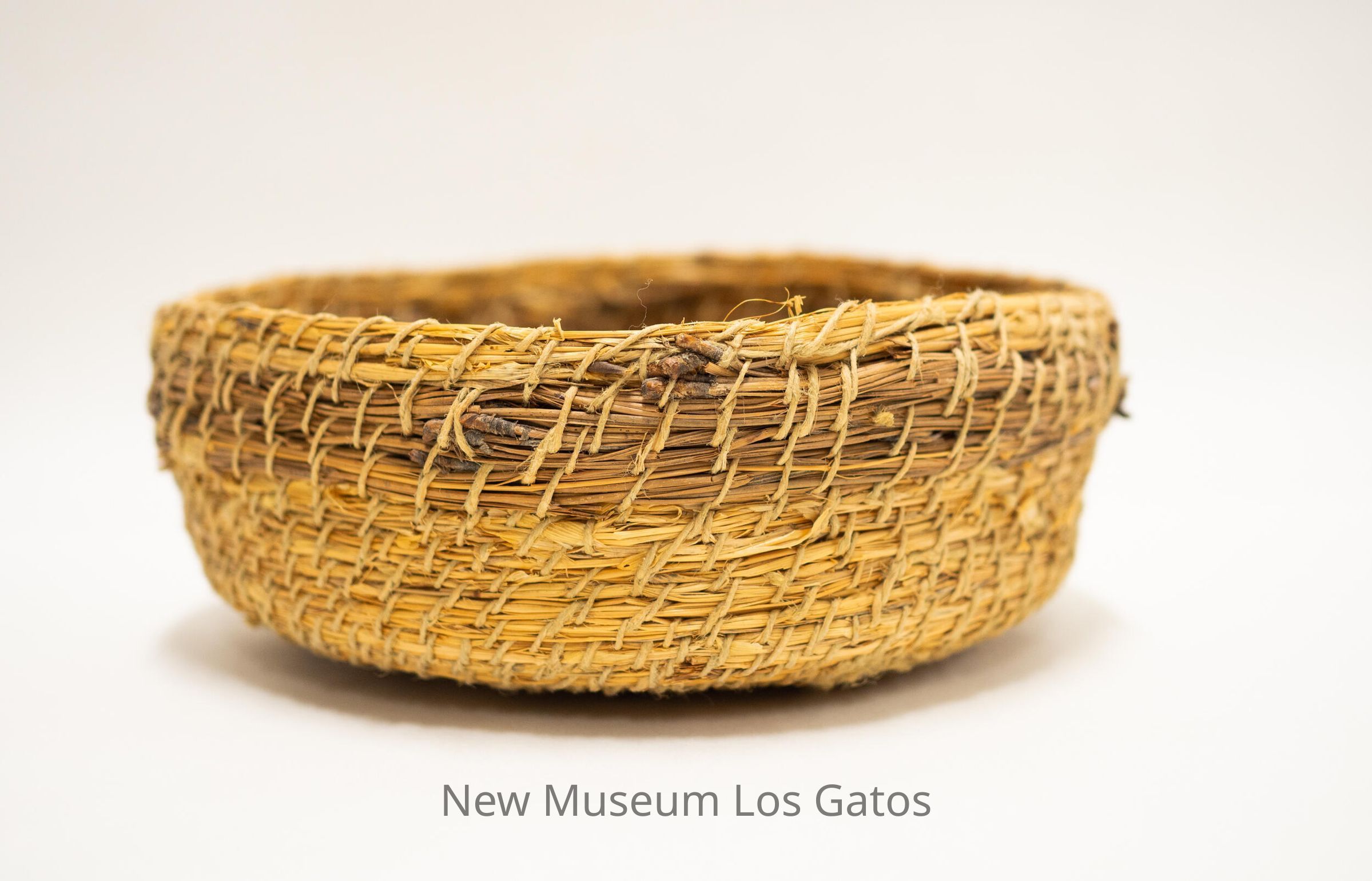 A medium-sized twined basket. The primary twined element appears to be made out of multiple materials, while the secondary twined element is a thin string. There is a small white sticker inside the basket that reads: "Basket 39.95."Collection