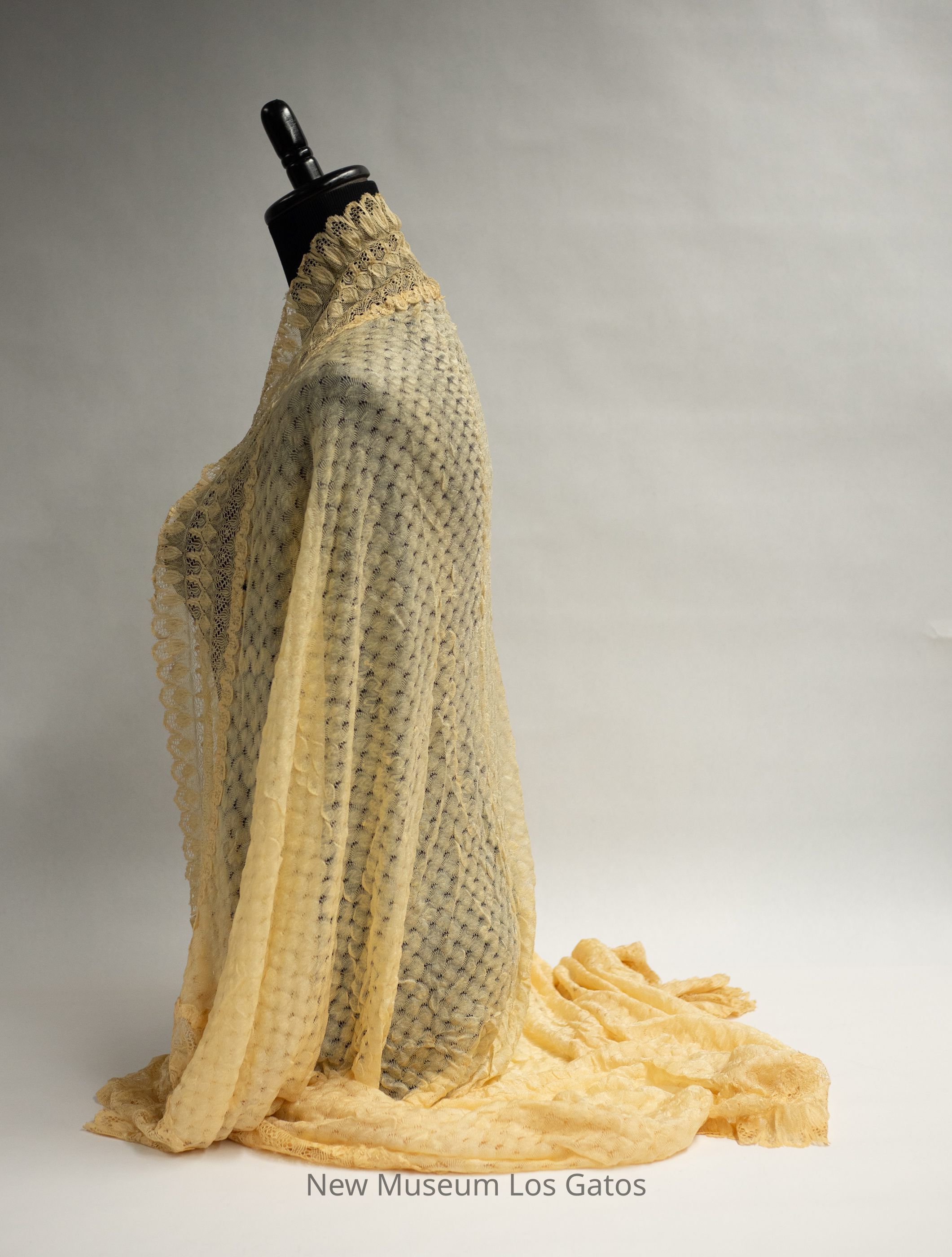 A large, lace, ecru-colored shawl. The center of the shawl features a scallop-like pattern, while the border of the shawl is looser, and features a more wavy pattern.Collection