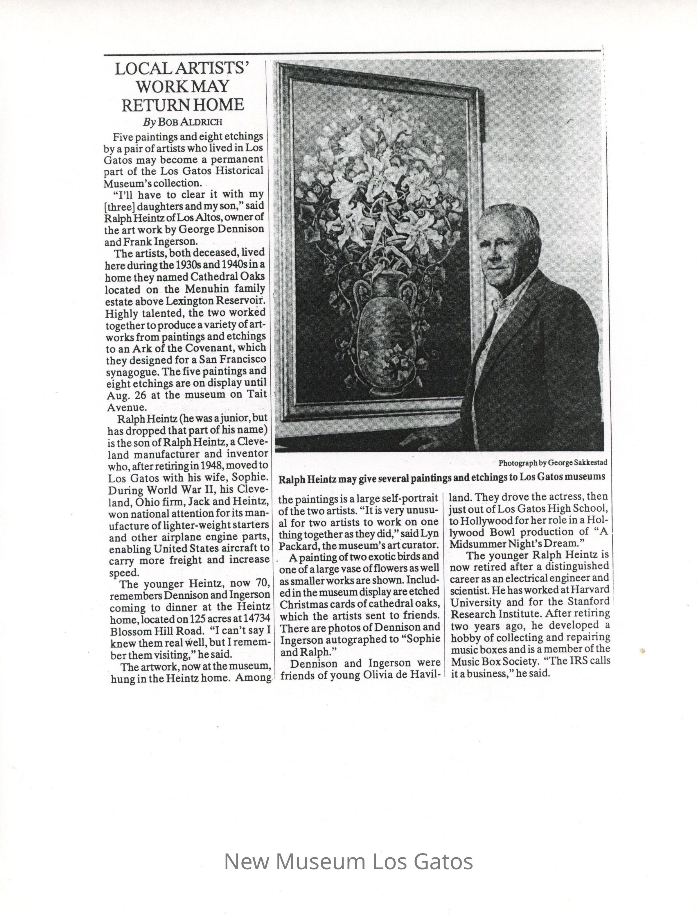Black and white photocopy of a newspaper clipping. The article contains a report on artworks done by Frank Ingerson and George Dennison being donated to the Los Gatos Historical Museum (New Museum Los Gatos). The artworks were donated by Ralph Heintz. The article has a photo of Ralph Heintz standing beside Untitled (Lilies and Ivy).
