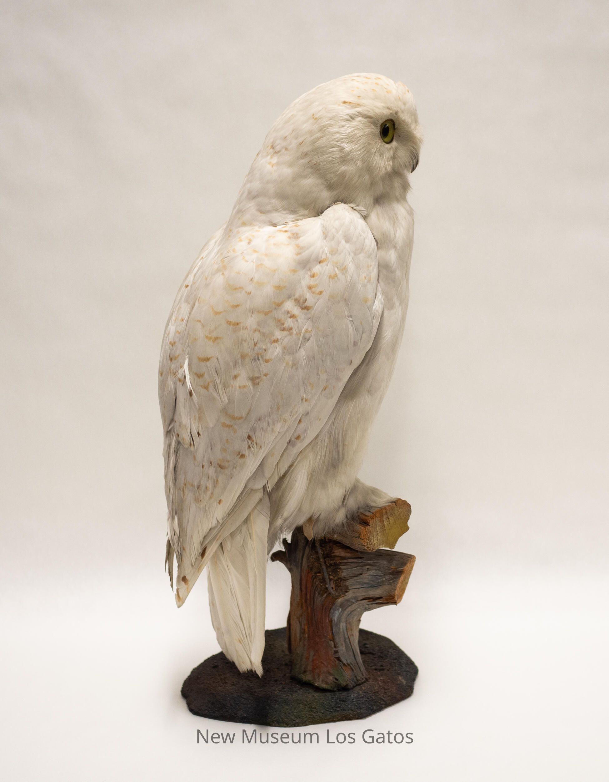 A taxidermied specimen of a Snowy Owl, or Bubo scandiacus. The owl is perched on a large tree branch, that is mounted into a base made to look like grass. The owl's wings are closed, and its head is turned so that it is looking off to its right. Family: Strigidae Genus: Bubo Species: B. scandiacus