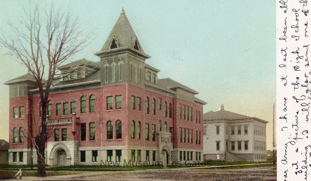 A postcard with an illustration of a large brown building, with a bare tree in the foreground and blue sky in the background.Subject