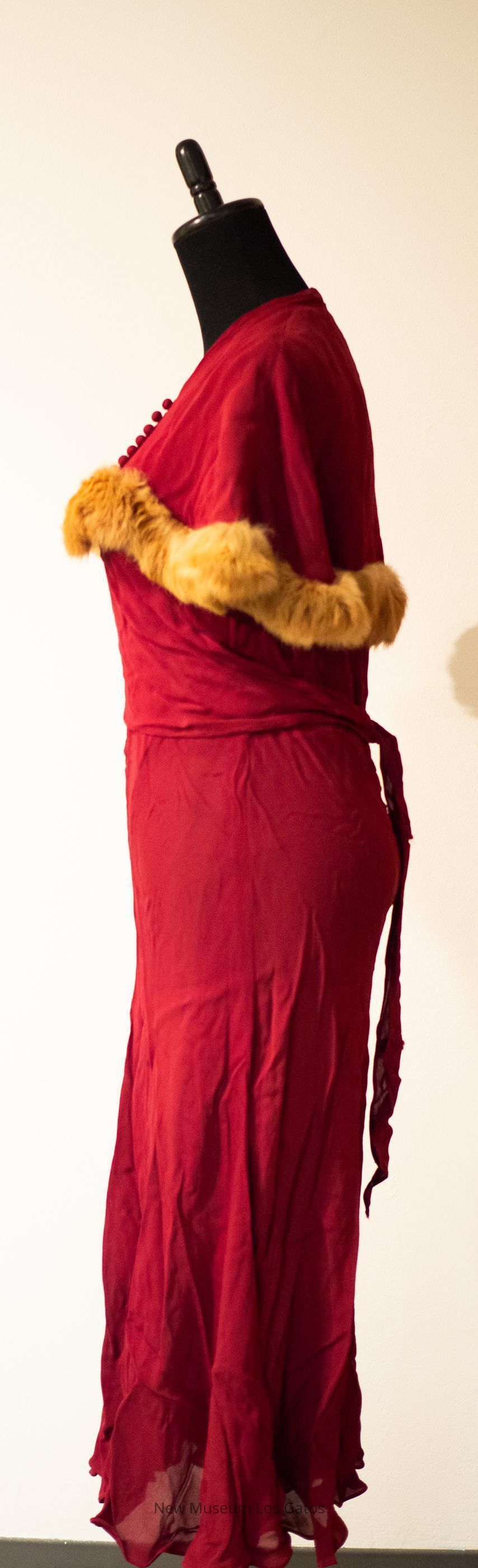 A long sleeveless maroon chiffon dress, with an attached capelet trimmed with brown fur. There are decorative buttons on the chest region. There are asymmetrical decorative seams on both the front and back.Collection