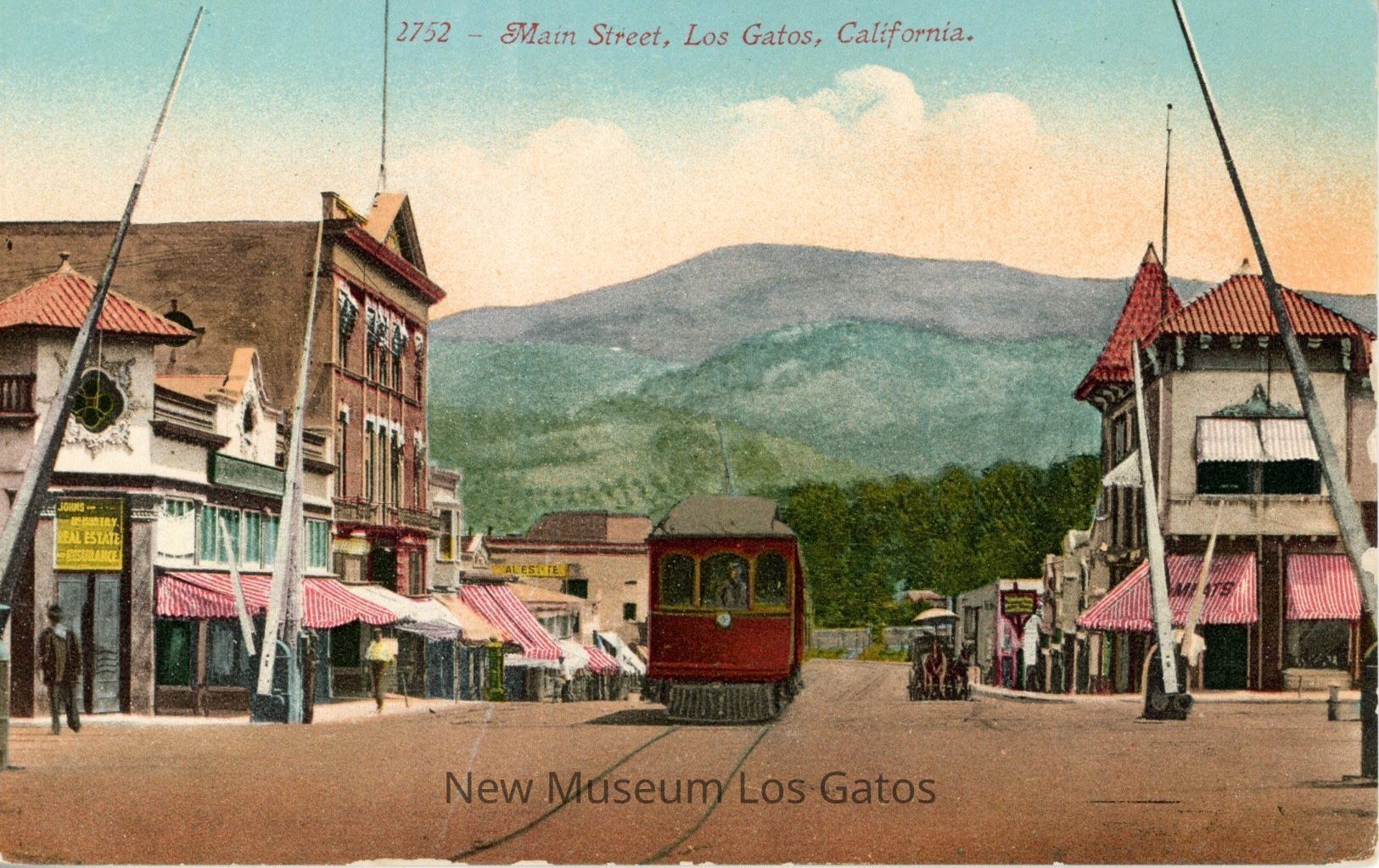 An unused, un-mailed postcard featuring a hand-colored image of Main St., in Los Gatos, California. There is a red trolley on its tracks in the center of the road, with the Opera House visible on the left.Subject Place